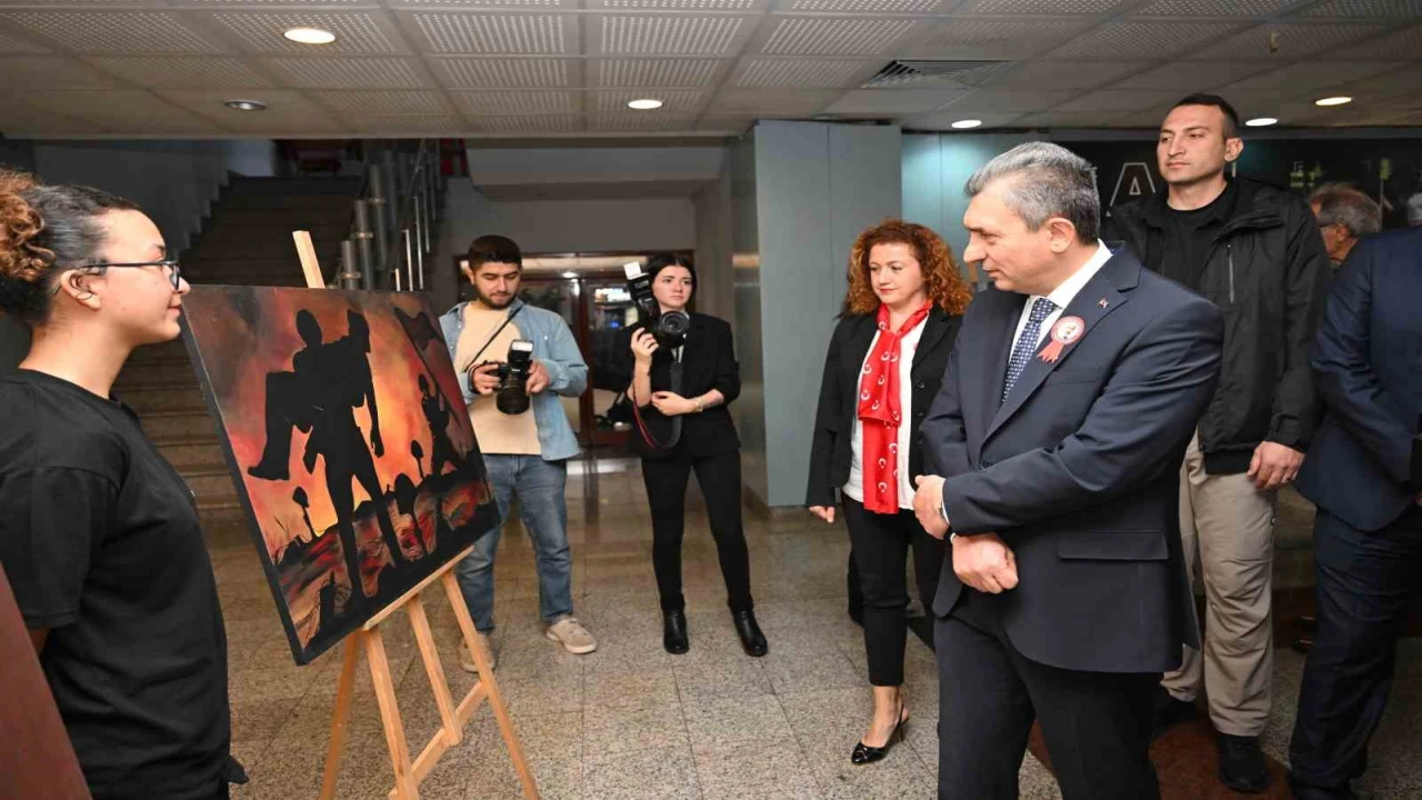 Gösterinin ardından öğrenciler ile birlikte hatıra fotoğrafı çektiren Vali Hulusi Şahin, fuaye alanında Mehmet Akif Ersoy’un hayatı ve İstiklal Marşı’nı anlatan resimlerin yer aldığı sergiyi gezdi.
