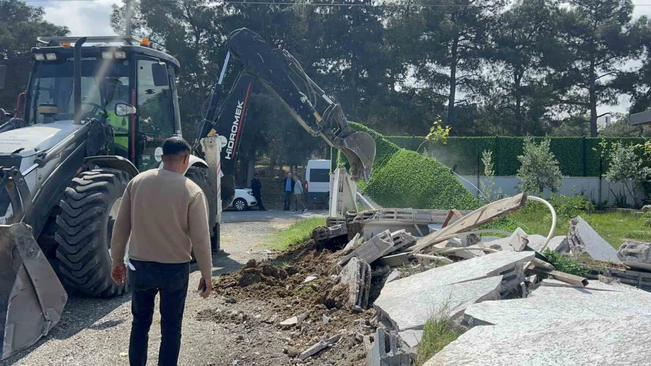 Kaçak yapının yıkımında dekor olarak kullanılan onlarca rögar kapağı dikkat çekti