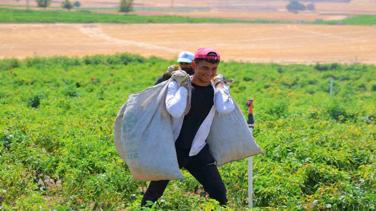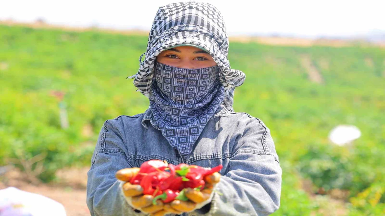 Hasat yapanlardan Elif Cengiz, "Tarlada biber topluyoruz. Yaptığımız iş çok zor Maraş biberi de kaliteli güzel" dedi.