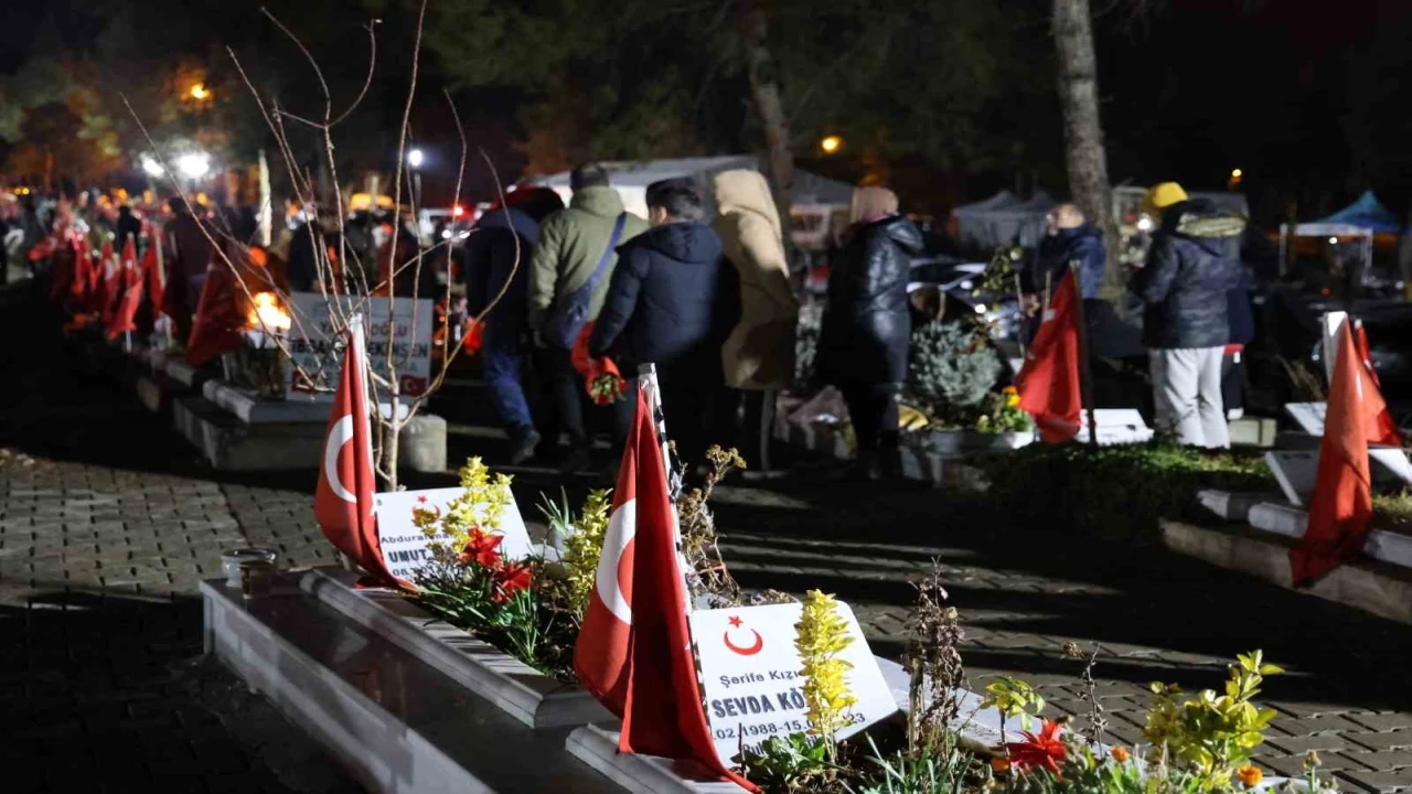 Kahramanmaraş’ta 6 Şubat 2023 depremlerinin yıl dönümünde, felakette hayatını kaybedenlerin yakınları gece saatlerinden, sabahın erken saatlerine kadar mezarlıklara akın etti. Depremin vurduğu kentte, en büyük mezarlıklardan biri olan Dulkadiroğlu ilçesindeki Kapıçam Mezarlığı, saatler 04.17’yi gösterdiğinde hüzünlü anlara sahne oldu.
