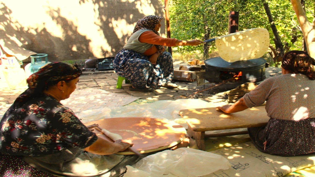Ekmek pişiren Ayşe Gören, "Yaklaşan kış aylarına hazırlığımız devam ediyor. Bunlardan biri olan yufka (açık) ekmeğimizi yapıyoruz. Mahallenin kadınları kış gelmeden toplanıp, imece usulü birbirimize yardım ederek ekmeğimizi yapıyoruz. Bu komşular arasında dayanışmanın ve beraberliğin en güzel örneğidir" dedi.
