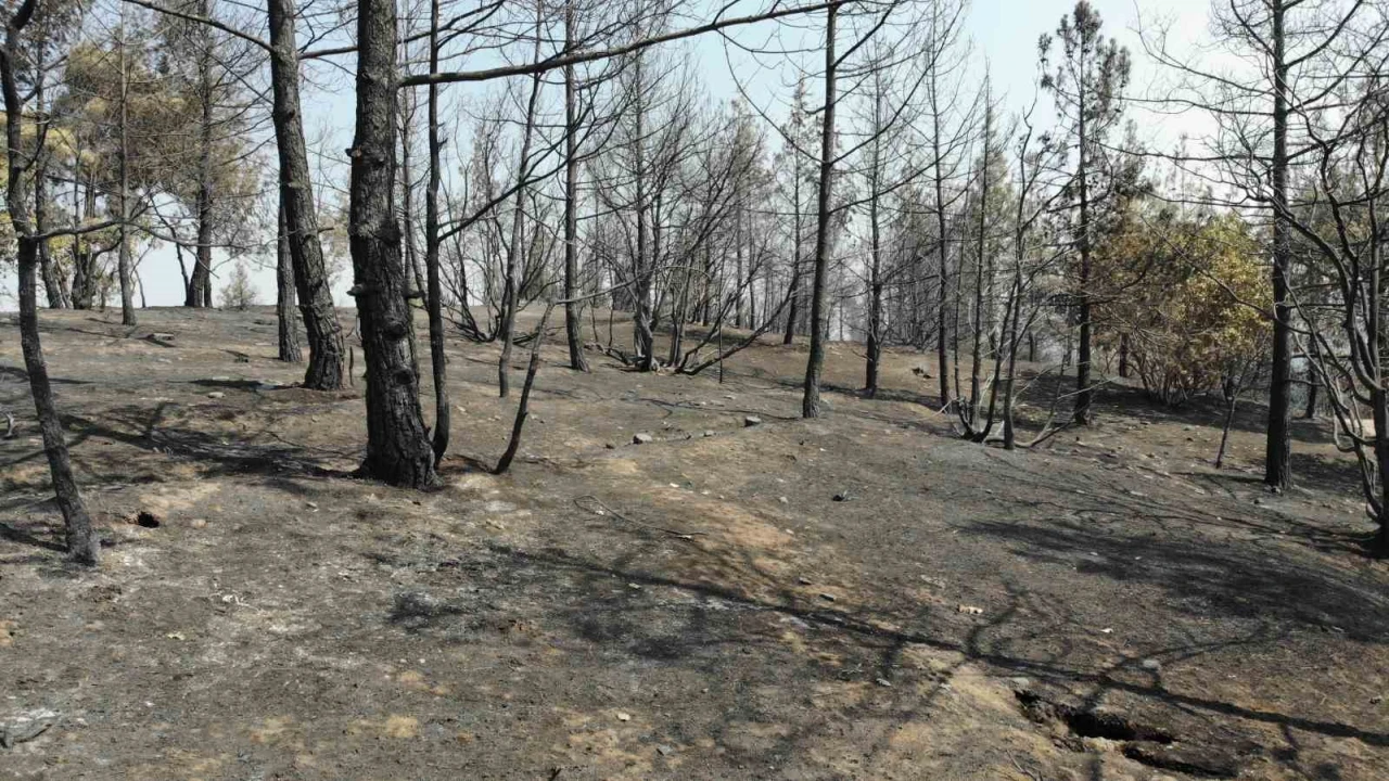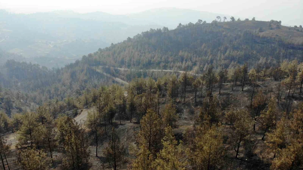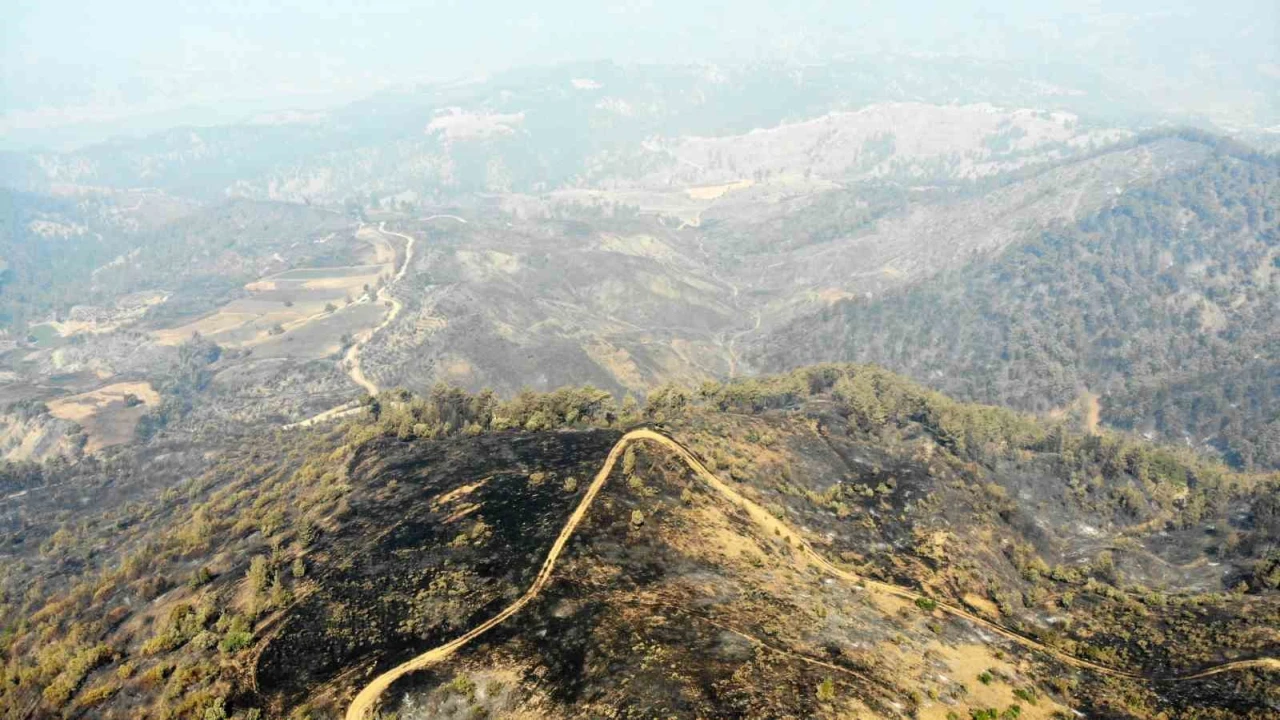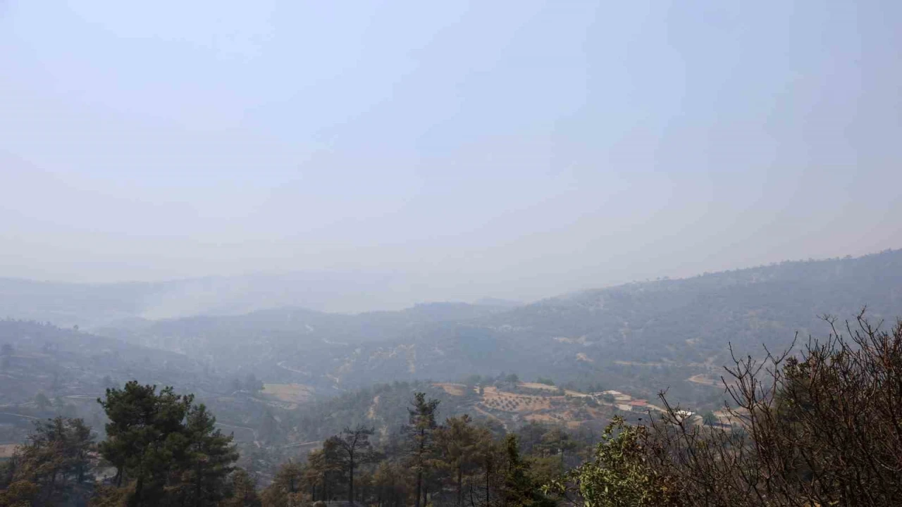 Yangının etkili olduğu ormanlık alandan yükselen dumanlar dron ile görüntülendi. Sarp ve ormanlık alandaki duman yoğunluğu dikkat çekti.