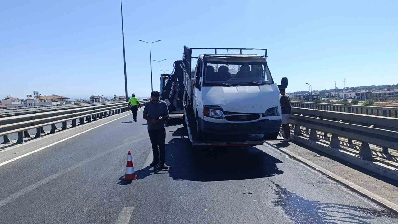 Edinilen bilgiye göre, Muhammet Karatepe’nin kullandığı 32 ABR 165 plakalı kamyonet Antalya istikametinden Alanya yönüne giderken kavşak üzerinde kontrolden çıkarak önce bariyerlere çarptı. Ardından Ömer Yıldırım idaresindeki 01 ED 787 plakalı otomobile çarpması sonucu kamyonet durabildi. Çarpışmanın ardından kamyonetin kasasındaki variller yola savrulması sonucu patatesler de etrafa saçıldı.