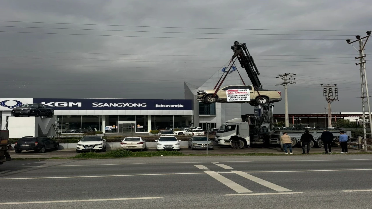 İddiaya göre, bir firma 2024 yılının Mart ayında SsangYong’un sıfır kilometre kamyonetini satın aldı. Şirketin sahibi, 100 bin kilometreye kadar ücretsiz bakım olduğu için en son 94 bin kilometrede araca bakım yaptırdı. Yapılan bakımda motor kısmında da herhangi bir sorun görülmedi. Ancak araç 101 bin kilometreye geldiğinde motor arızası verdi. Kamyonet firmaya tamire götürüldüğünde motorunun tamamen çalışamaz halde olduğu bilgisi verildi. Firma aracın 6 bin kilometre önce bakıma getirildiğini ancak herhangi bir arızasının çıkmadığını, bu nedenle motorda meydana gelen arızada firmanın kusurlu olduğunu ileri sürerek yapılmasını ya da yeni motor verilmesini talep etti. Ancak SsangYong firması bu durumu kabul etmedi. Bunun üzerine aracı satın aldığı Kavaklı Mahallesi Turhan Cemal Beriker Bulvarı’ndaki SsangYong araç bayisine gelen firma yetkilileri, kamyoneti vinçle asarak eylem yaptı. Vatandaşlar, aracın üzerine de "Alma, kandırılma. Satarken gösterilen memnuniyet, satıştan sonra sağlanmıyor" yazılı pankart asarak sergiledi. Bir süre sonra eylem sonlandırıldı.