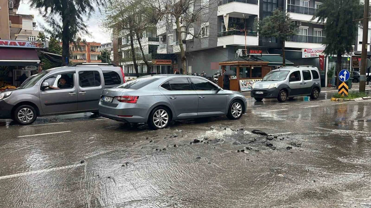Antalya’nın Alanya ilçesinde kanalizasyon borusunun patlaması sonucu yol suyla kaplandı, sürücüler zor anlar yaşadı.