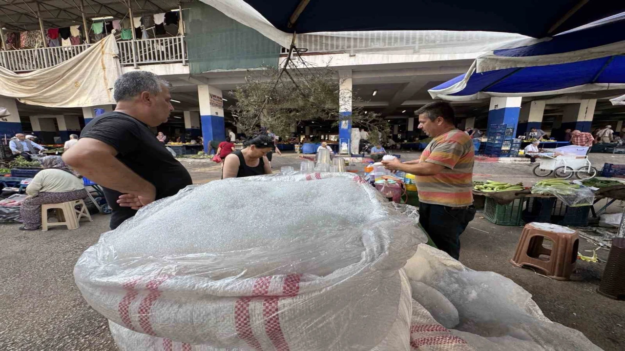 ANTALYA'NIN 2 BİN 500-3 BİN RAKIMLI DAĞLARIN ZİRVESİNDE BİN BİR ZAHMETLE TOPLANARAK YIĞIN YAPILAN KARLAR, YAZ AYLARINDA SERİNLEMEK İSTEYENLER İÇİN ANTALYA'NIN SEMT PAZARLARINDAKİ TEZGAHLARDA YERİNİ ALDI.