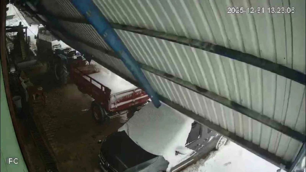 HATAY’DA ETKİLİ OLAN ŞİDDETLİ YAĞIŞLA BİRLİKTE BİRİKEN KAR KÜTLESİNİ TAŞIYAMAYAN FABRİKA ÇATISININ PARK HALİNDEKİ 3 ARACIN ÜZERİNE ÇÖKTÜĞÜ ANLAR KAMERAYA YANSIDI.