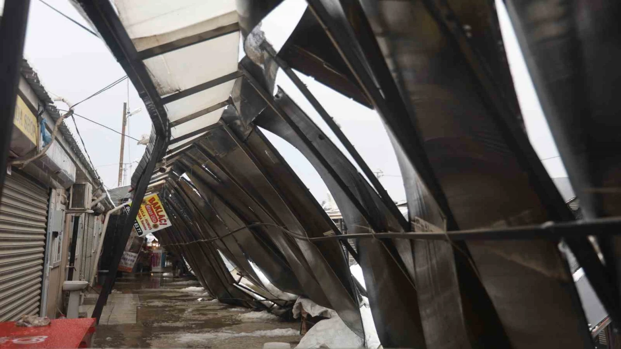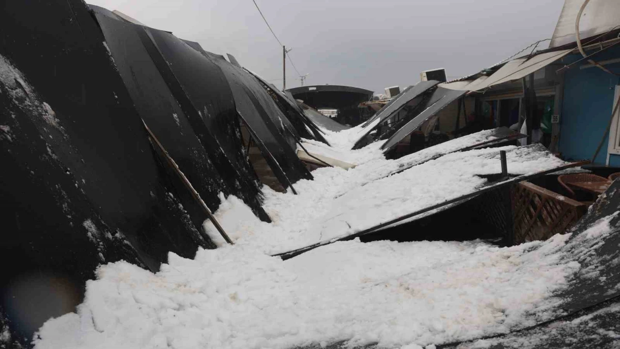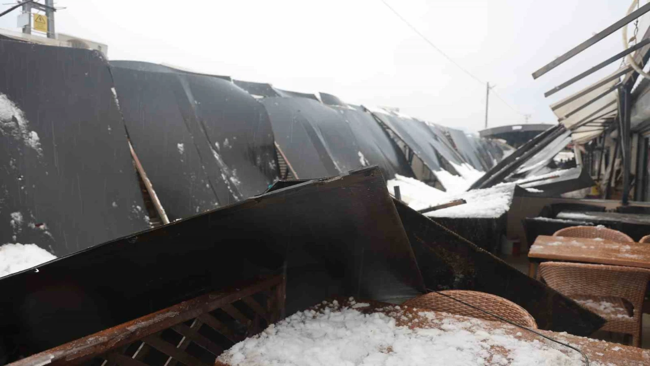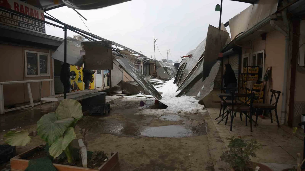 Meteorolojinin şiddetli yağış uyarısında bulunduğu Hatay’da gece saatlerinden itibaren kar yağışı etkili oldu. Şiddetli yağışla birlikte çevre beyaza bürünürken Antakya ilçesi eski otogar mevkiinde bulunan prefabrik çarşının çatısı da karla kaplandı. Kar kütlesini taşıyamayan plastik çatı, yerle bir oldu. Çatının yerle bir olduğu anlar güvenlik kamerasına yansırken olayda yaralanan olmadı.