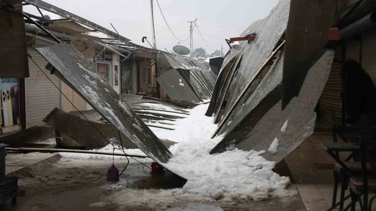 Hatay’da etkili olan şiddetli yağışla birlikte biriken kar kütlesini taşıyamayan prefabrik çarşısının plastik çatısı yıkıldı. Çatının yerle bir olduğu anlar kameraya yansırken olayda yaralanan olmadı.