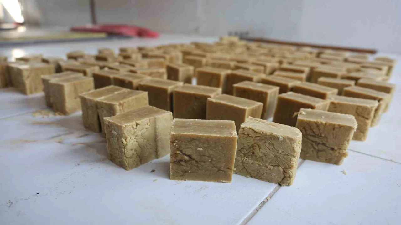 Kostiği koyduktan sonra durmadan 40 dakika boyunca karıştırıyoruz. Karıştırdıktan sonra kalıba döküp 1 saat sonra kesip kalıp haline geliyor. Sabunların fiyatları, defne yağının oranına göre değişiyor. Bu yıl sabun fiyatları çok pahalı oldu, defne yağı çok bulunmuyor. Defne yağının kilosu bin TL ile bin 200 TL arasında değiştiği için bu yıl sabun yapılışı az olur. Defne yağının oranı yüzde 50 olduğu sabunun kilosu bin TL ile bin 250 TL arasında iken defne yağının oranı yüzde 100 olduğunda sabunun kilosu bin 500 TL ile 2 bin TL arasında değişiyor.