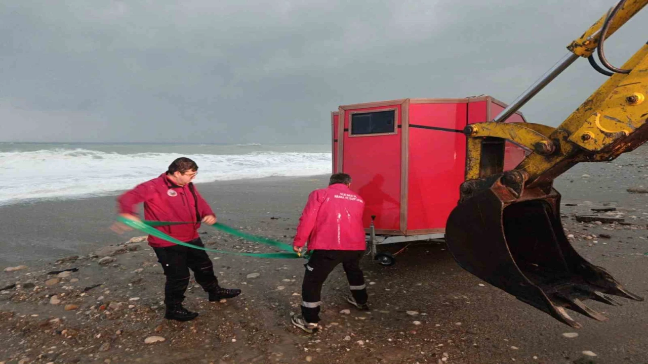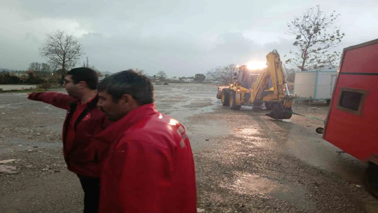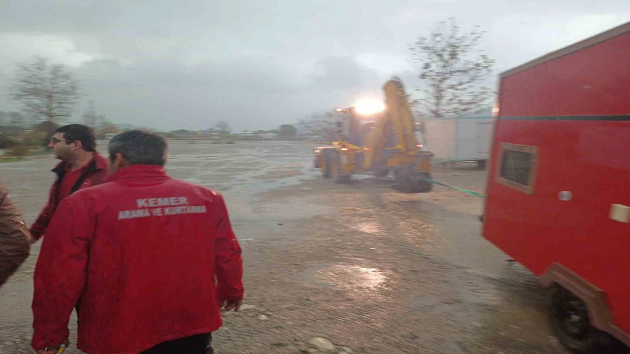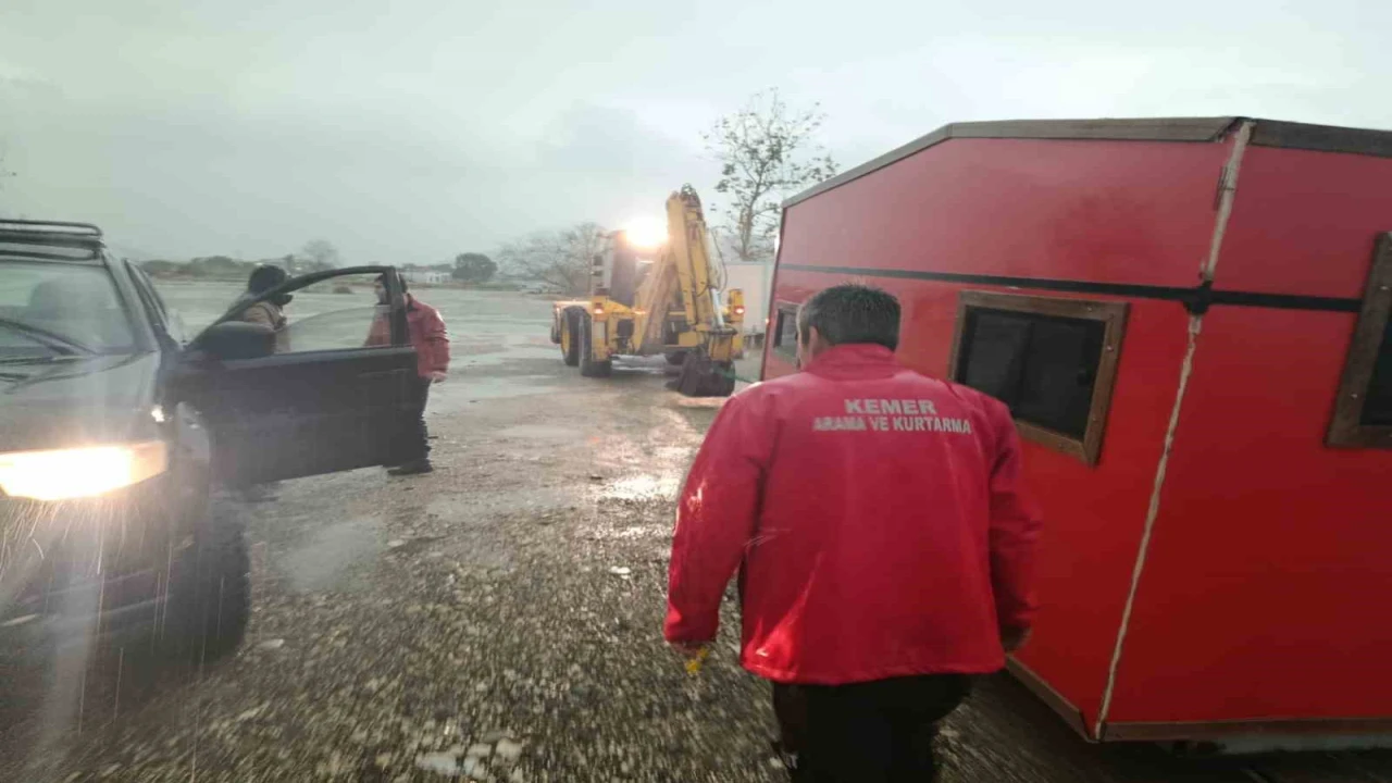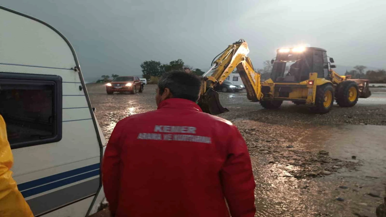 Kemer’de bugün sabah saatlerinde başlayan ve öğle saatlerinde etkisini artıran sağanak sonrası Kemer Belediyesi ekipleri teyakkuza geçti. Ağva Deresi’nin denizle buluştuğu Çamyuva sahilinde karavanlarında mahsur kalan Rus turistleri Kemer Belediyesi Afet İşleri Müdürlüğü ve Kemer Arama Kurtarma Derneği (KEMKUT) ekipleri, Kemer Belediyesi Fen İşleri Müdürlüğü’ne ait bir kepçe yardımı ile kurtardı. Turistlerin olduğu karavanı bulunduğu yerden çeken ekipler, içerisinde kimsenin bulunmadığı bir başka karavanı da kıyıya çekti.