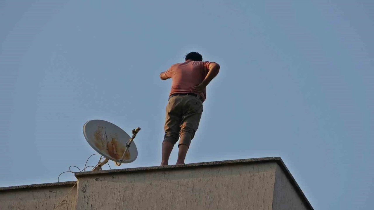 Bahadır T. zaman zaman çatıdaki korkuluklara çıkıp tehlikeli hareketlerde bulunurken, mahalleliler ise olan biteni meraklı gözlerle izledi.