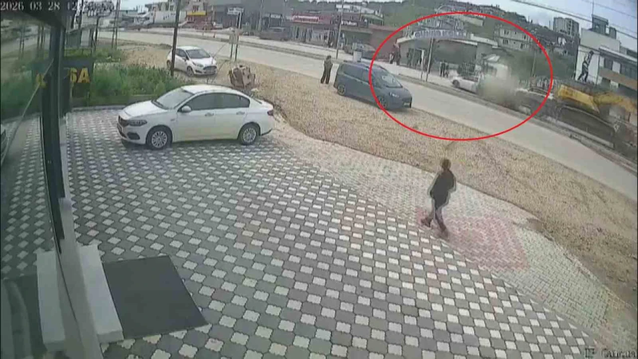 Hatay’da iş makinası yüklü ağır tonajlı tır sürücüsünün ışıkta bekleyen otomobile ve karşıdan karşıya geçmek için yolun sağında bekleyen öğrencilere çarpmamak için manevra yaparak refüje çıktığı anlar an be an kameraya yansıdı.