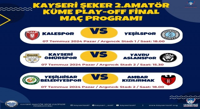 Kayseri Şeker 2. Amatör Küme A, B ve C gruplarında ilk iki sırayı alan takımların mücadele edeceği Play-Off final maçları programı belli oldu. 07 Temmuz Pazar günü Argıncık Stadı 1 ve 2 Nolu Sahada oynanacak olan Play-Off final yarı maçlarını kazanan takımlar adlarını 1. Amatör Küme’ye yazdıracaklar. Oynanacak olan karşılaşmaların ardından 6 takımdan 3’u bir üst lige yükselecek. Play-Off final maçlarında Kayserili futbolseverlerin yoğun ilgi göstermesi bekleniyor.