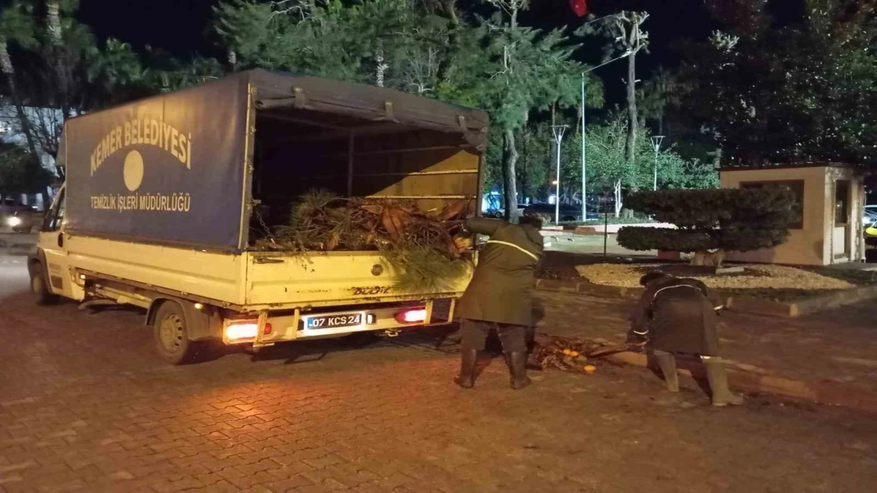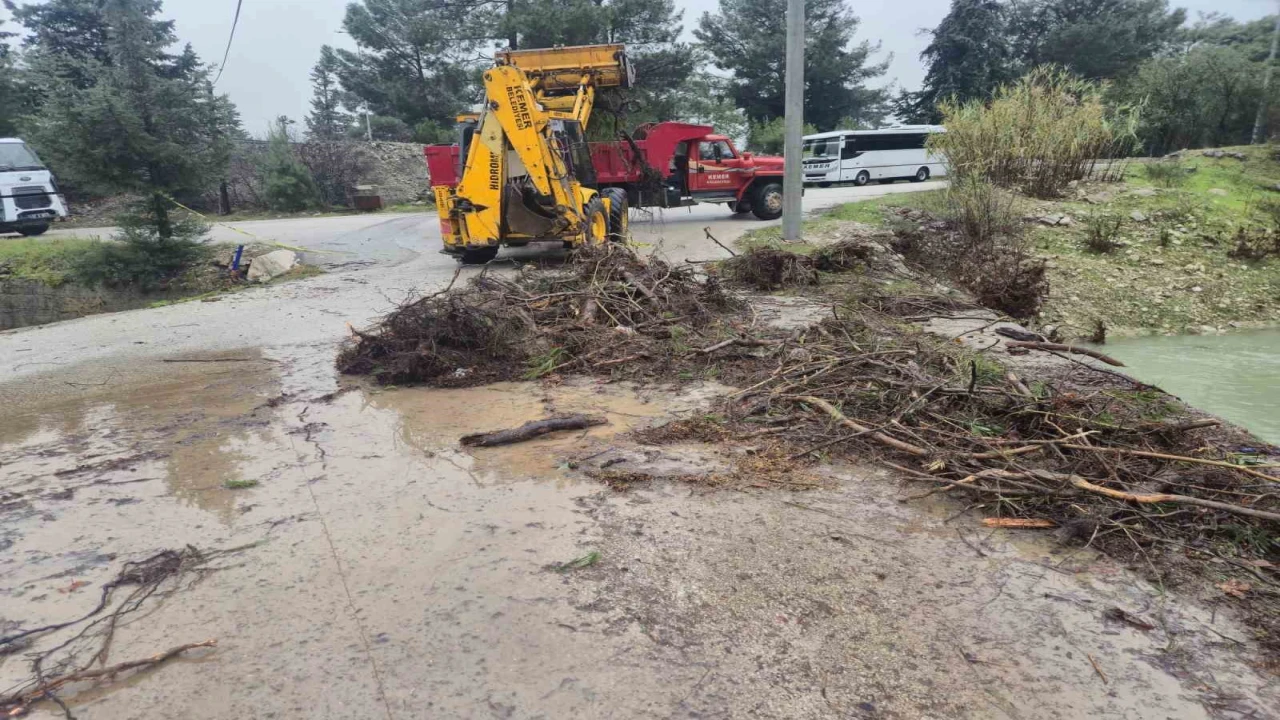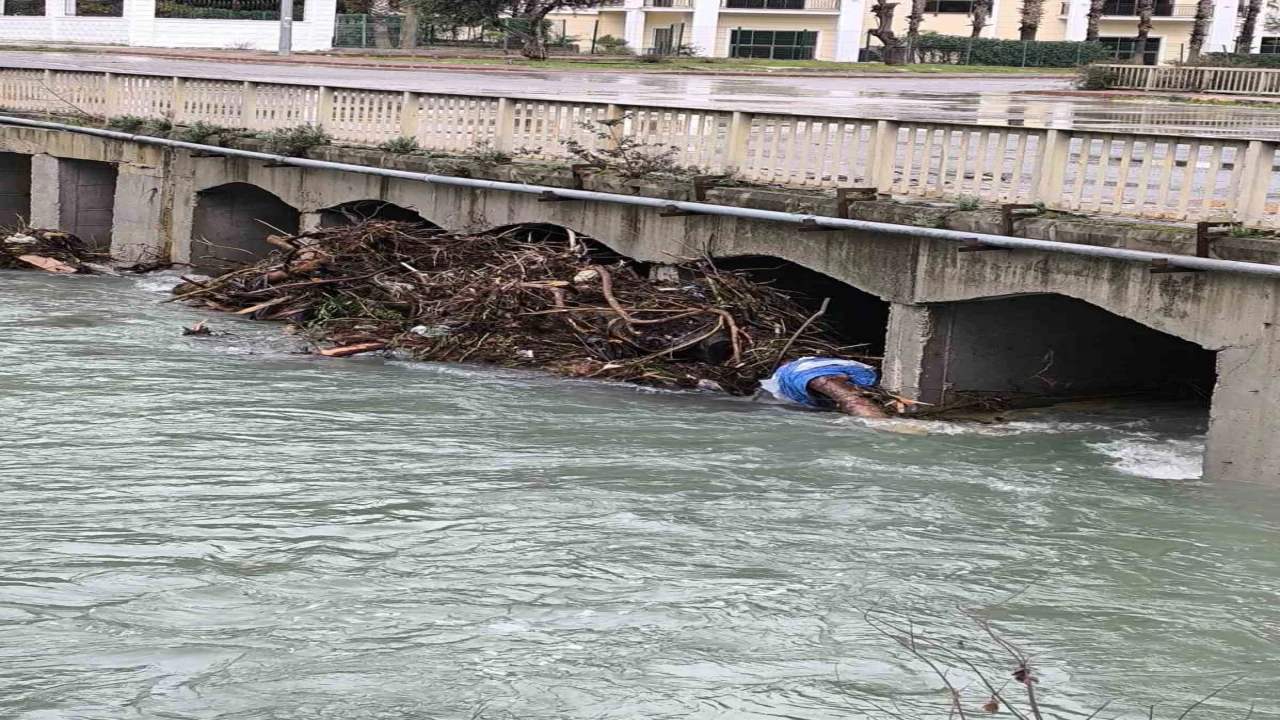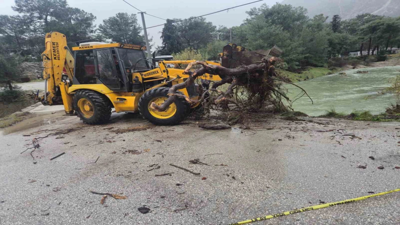 Kemer Belediye ekipleri, Beldibi Mahallesi’nde şiddetli sağanak nedeniyle dağlık alandan koparak akıntıyla birlikte gelen ve köprüleri tıkayan tomruklar ile atıkların temizliğini yaptı.