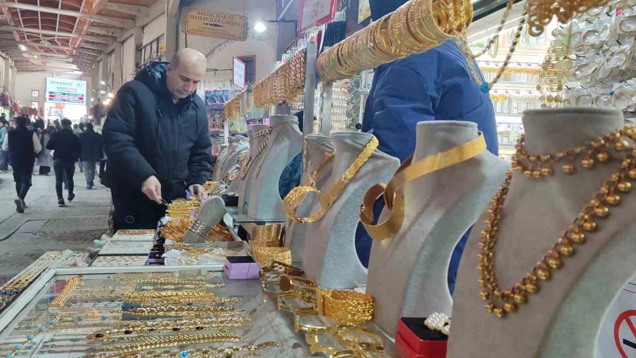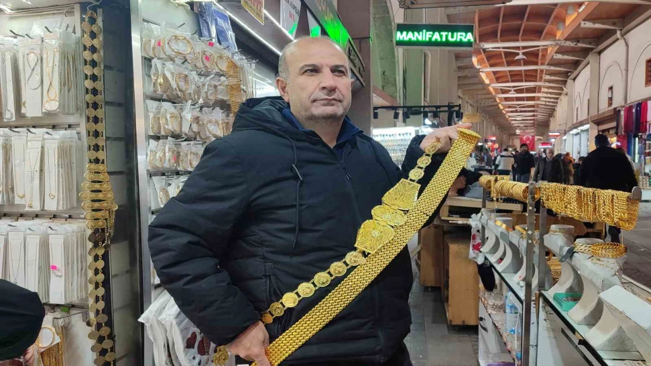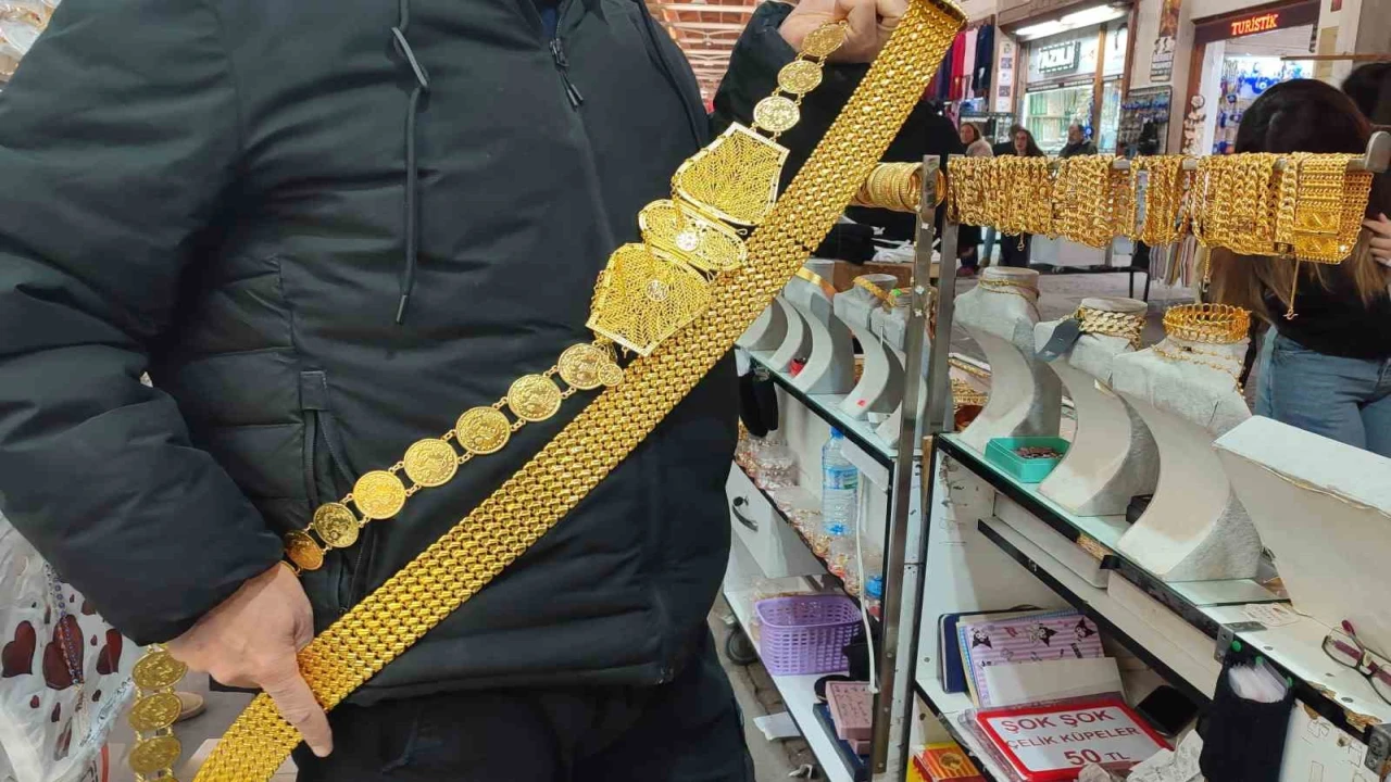Altın fiyatlarının yükselmesiyle birlikte düğün yapacak kişiler imitasyona yöneldi. Kahramanmaraş’ta tarihi Kapalıçarşı’da altın kemerin imitasyonu bin TL’ye satılıyor.