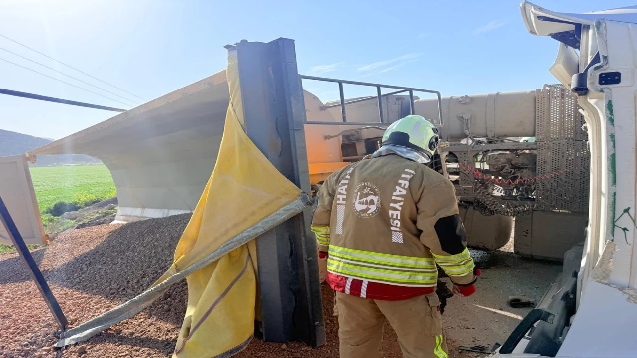 HATAY (İHA) - Hatay’da sürücünün kontrolünü kaybetmesiyle devrilen hafriyat kamyonunun sürücüsü yaralandı.