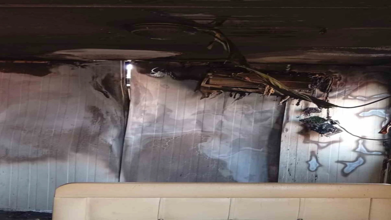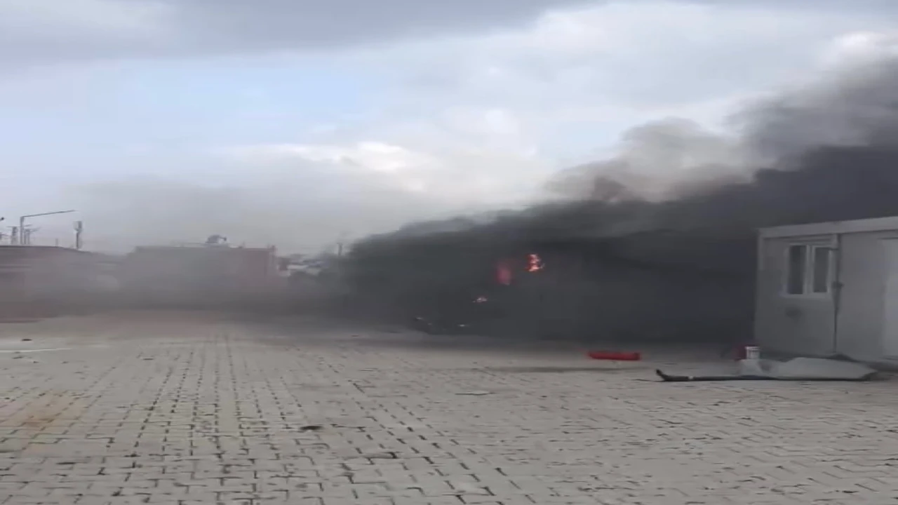 Hatay’da depremzede ailenin yaşadığı konteyner alev alev yanarak kullanılmaz hale geldi.