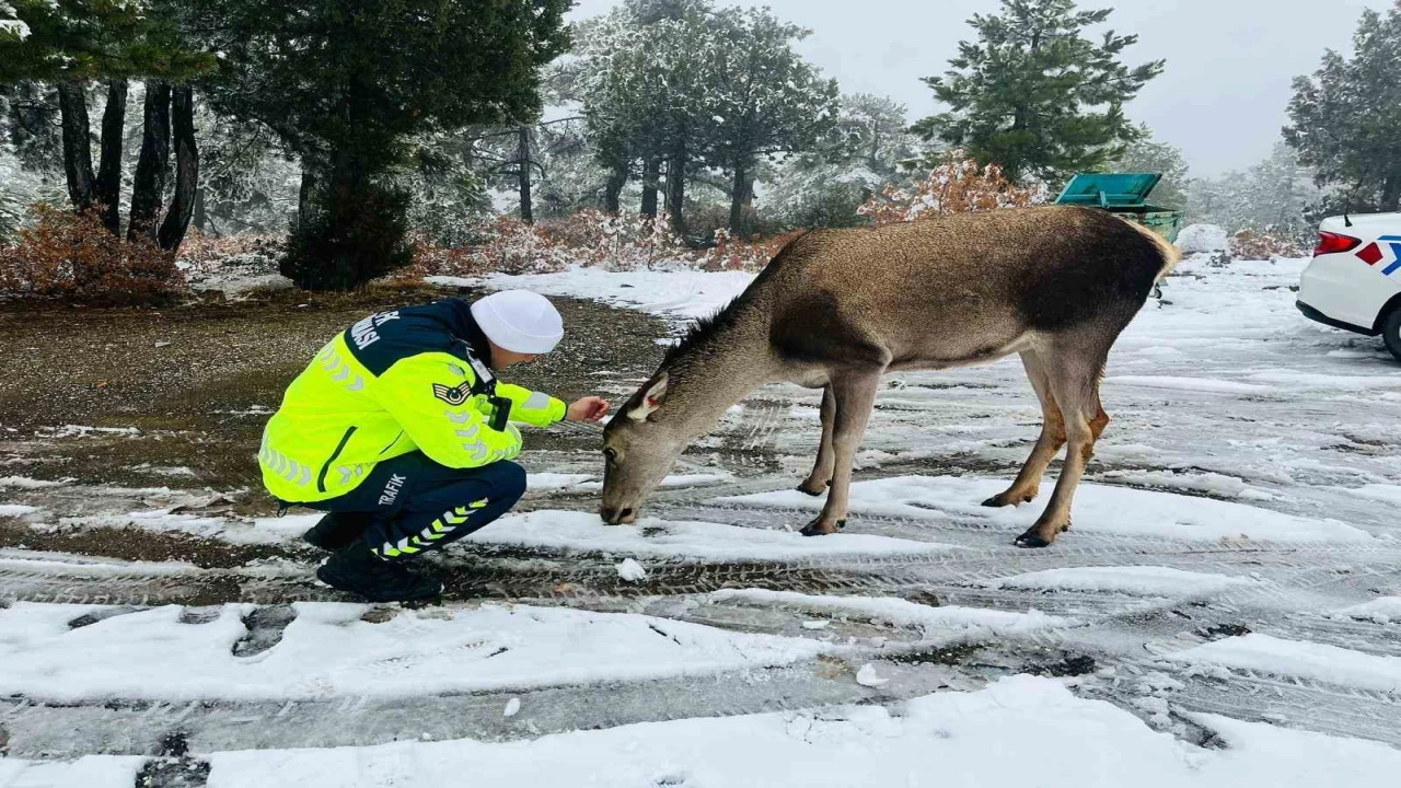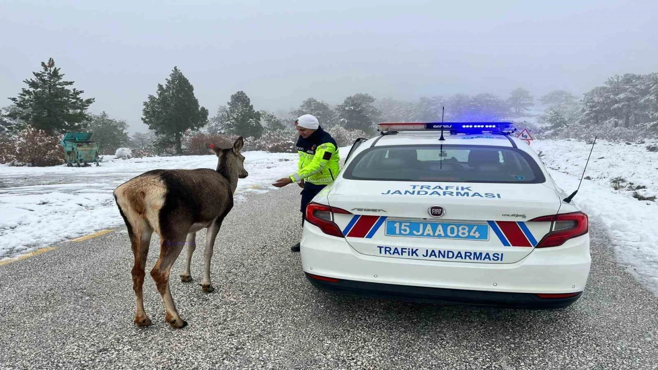 Eşeler Yaylası’na salınan kızıl geyiklerden biri, Yeşilova ilçesindeki Salda Kayak Merkezi yakınlarında karla mücadele çalışması yürüten jandarma trafik ekiplerinin yanına kadar yaklaştı. O anlar renkli görüntülere sahne olurken, ekipler bu beklenmedik ziyaret karşısında hayvanın sakinliğine hayran kaldı.