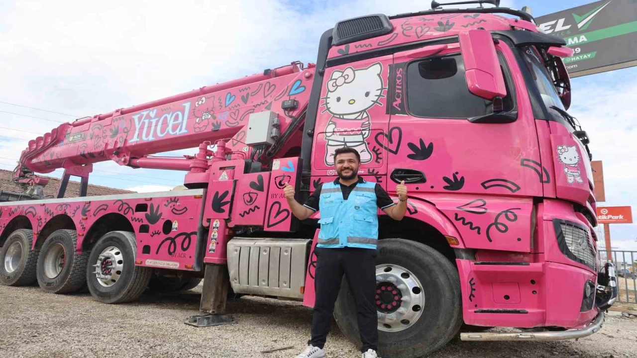 HATAY (İHA) - Hatay'da vinç sektöründe hizmet veren Kamil Yücel, kızının ‘Baba bizim neden pembe vincimiz yok, bizim de pembe vincimiz olsun' sözlerinden ilham alarak tasarladıkları; pembe, mor, siyah ve gri vinçlerle inşaat sektörüne renk katıyor.