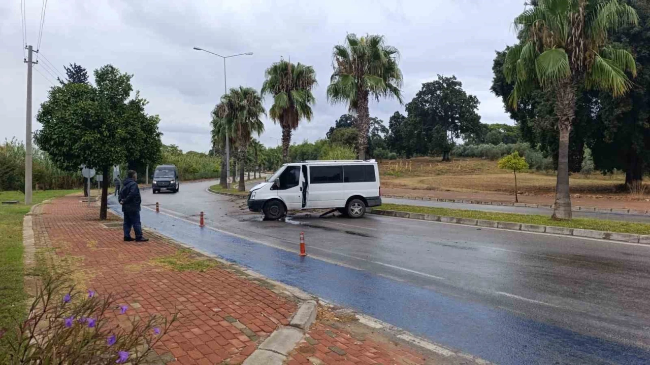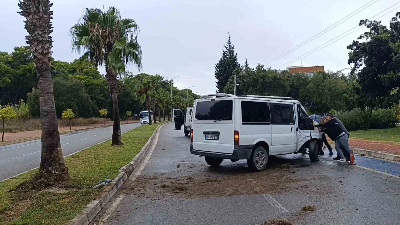 MANAVGAT’TA YAĞMUR NEDENİYLE KAYGANLAŞAN YOLDA SÜRÜCÜSÜNÜN DİREKSİYON HAKİMİYETİNİ KAYBETTİĞİ TRANSİT, ÖNCE KALDIRIMA ARDINDAN PALMİYE AĞACINA ÇARPTI. KAZADA ŞANS ESERİ YARALANAN OLMAZKEN, ARAÇ YOLUN ORTASINDA KALINCA TRAFİK BİR SÜRE AKSADI.