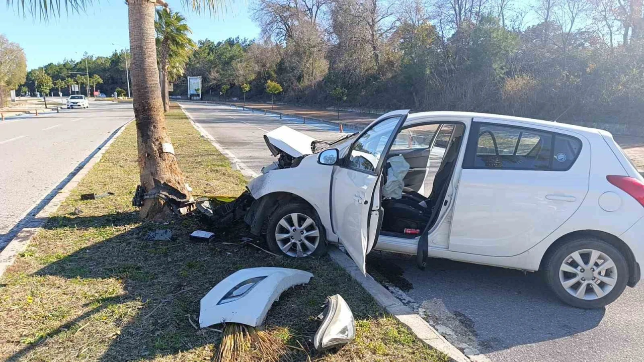 Manavgat’ta sürücüsünün direksiyon hakimiyetini kaybetmesi sonucu palmiyeye çarpan otomobilde bulunan yolcu yaralandı. Çarpmanın şiddetiyle otomobilin plakası çarptığı ağaca yapıştı.