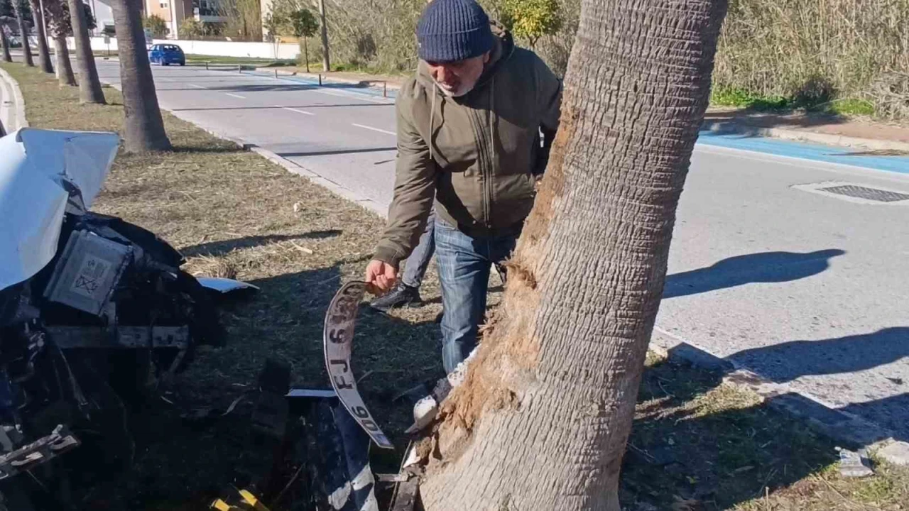 Kaza sonrası otomobil hurdaya dönerken çarpmanın şiddetiyle otomobilin ön tarafından bulunan plaka palmiye ağacına adeta çivilendi.