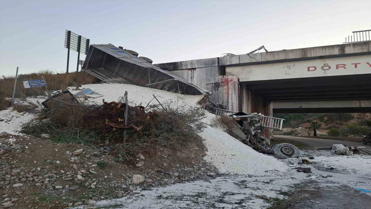 Kaza, Adana – Hatay otoyolu Dörtyol ilçesi Özerli köprüsü mevkiinde yaşandı. Kamyonet ve otomobilin çarpıştığı kaza sonrası Furkan Orhan Y. idaresindeki 01 ATT 106 plakalı tır, kaza yapan otomobil, kamyonet ve park halindeki tıra çarptı. Kaza sonrası 01 ATT 106 plakalı tır, köprüden aşağı uçarak alevlere teslim oldu. İhbar üzerine bölgeye itfaiye ve sağlık ekipleri sevk edildi.
