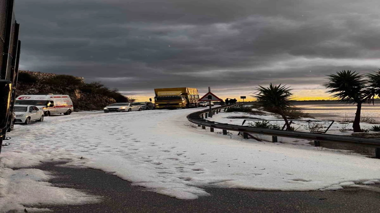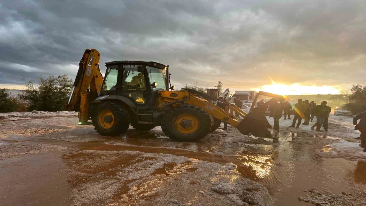 Beymelek Mahallesi İskele mevkiinde dolu ve şiddetli yağış nedeniyle D-400 karayolu, saat 17.00 civarında yolda oluşan birikintiler nedeniyle 4 noktadan tedbir amaçlı trafiğe kapatıldı. Çok sayıda araç yolda kalırken, Antalya Büyükşehir Belediyesi’ne ait iş makinelerinin desteği ile yaklaşık 1.5 saatlik çalışmanın ardından karayolunda trafik tek şeritten kontrollü olarak sağlanmaya başladı.