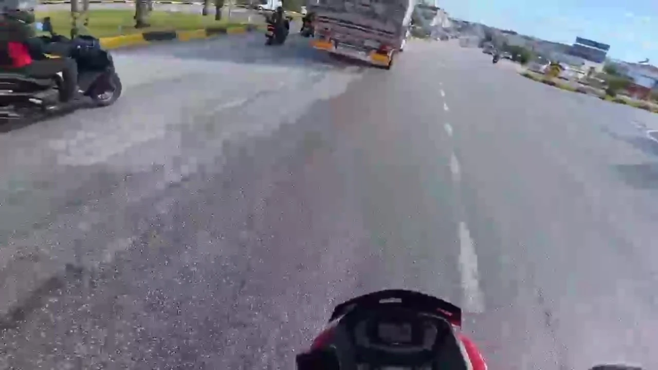 ANTALYA’DA TRAFİKTE KENDİSİNE KORNA ÇALAN MOTOSİKLET SÜRÜCÜLERİNİN ÜZERİNE KIRAN VE DEFALARCA ÖLÜMLE BURUN BURUNA GETİREN KAMYON SÜRÜCÜSÜNÜN GÖRÜNTÜLERİ KASK KAMERASINA YANSIDI