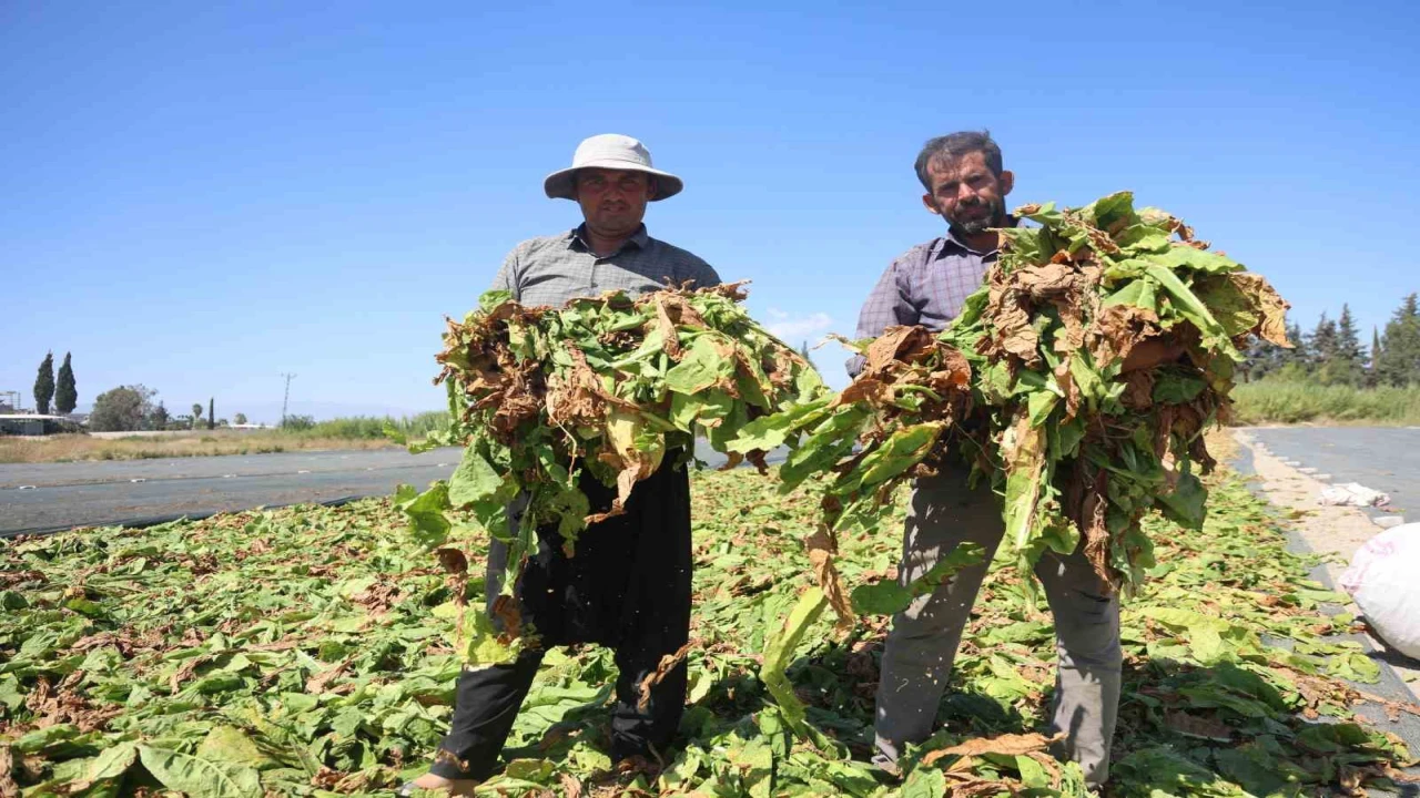 Hava sıcaklıklarının mevsim normallerinin üzerinde ilerlediği Hatay'da tütünde hasat devam ediyor. Tarlada zor şartlarda toplanan ve açık arazide kurutulmaya bırakılan tütün için çiftçilerin ve işçilerin zorlu mesaisi sürüyor. Antakya ilçesi Demirköprü Mahallesi'nde hasat edilen tütünün kurutulmaya bırakıldığı araziyse adeta renklendi. Çiftçi Cuma Yılmaz, kurutulmuş tütünün kilogram fiyatının tarladan 165 TL'den satıldığını söyledi.