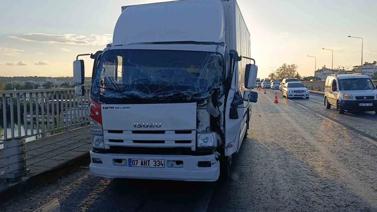 Antalya’nın Manavgat ilçesi Çevreyolu Köprüsü üzerinde meydana gelen kazada, Antalya istikametinden Alanya yönüne gitmekte olan Şadi M. idaresindeki 07 AHT 334 plakalı kamyon, aynı yönde ilerleyen Osman A’nın kullandığı 34 EZE 891 plakalı, 31 AOH 33 dorse plakalı tıra sağ arka kısmından çarptı.