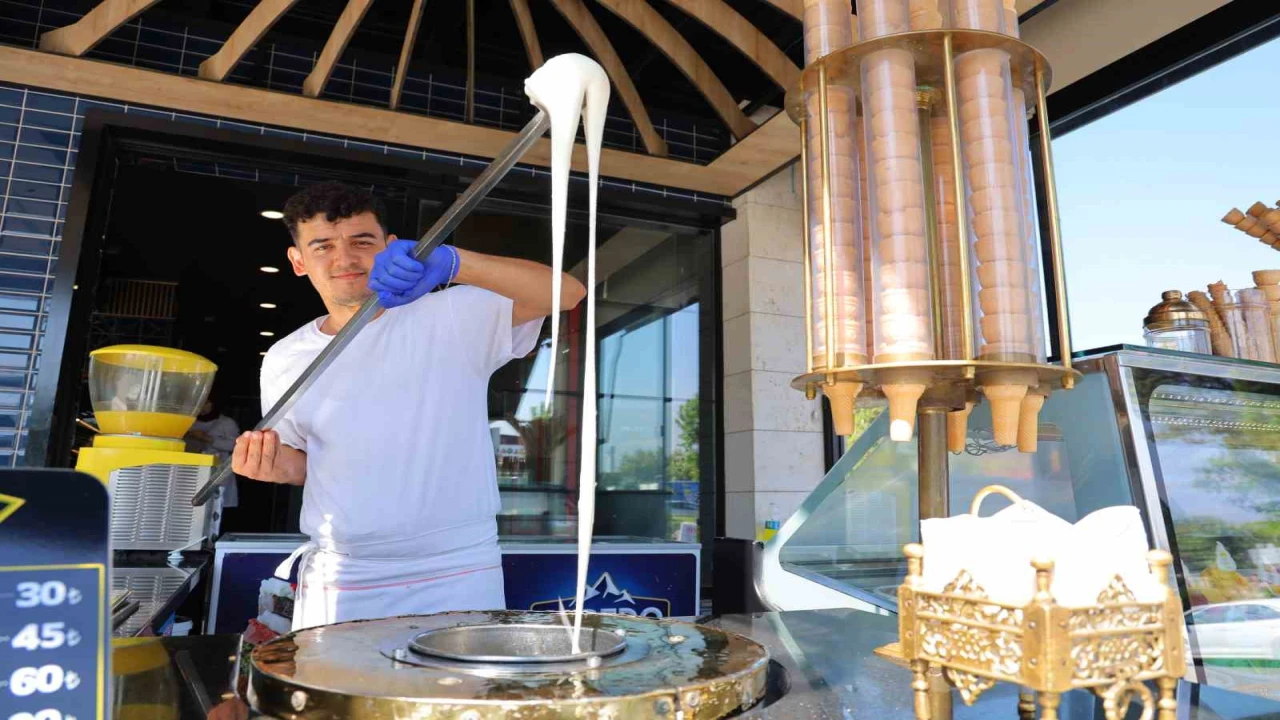 YOĞUN KIVAMI, GEÇ ERİYEN YAPISI VE ÇİĞNENEBİLİR ÖZELLİĞİYLE BİLİNEN MARAŞ DONDURMASI, KEÇİ SÜTÜ VE DOĞAL SALEP KULLANILARAK ÜRETİLİYOR.