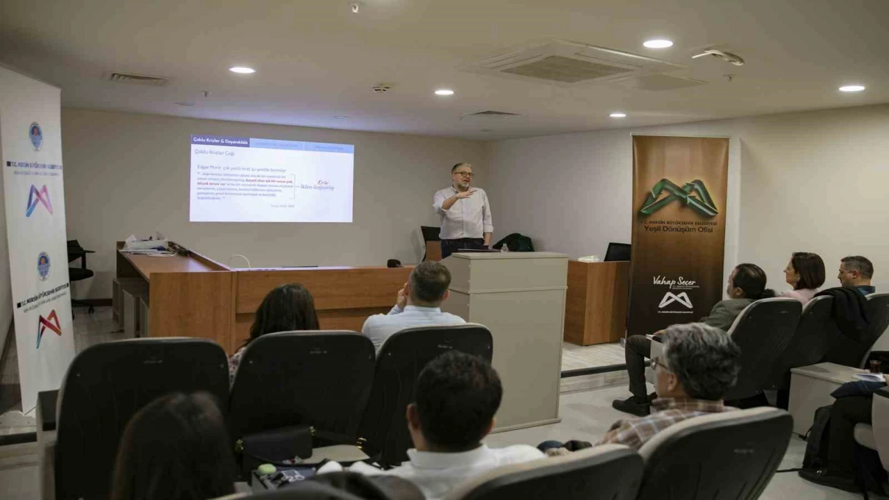 Mersin’de döngüsel ekonomi yaklaşımıyla uyumlu, doğal kaynakları koruyan, iklim ve sürdürülebilirlik hedeflerine katkı sağlayan, kaynak verimli ve düşük karbonlu üretimi amaçlayan yatırımların ve çalışmaların desteklenmesine yönelik olarak çalışmalarını yürüten Yeşil Dönüşüm Ofisi, önemli bir eğitime imza attı. ‘Yeşil İşler, Yeşil Beceriler ve Yeşil Girişimcilik’ başlıklı eğitim, Afyon Kocatepe Üniversitesi’nden Doç. Dr. Murad Tiryakioğlu tarafından verildi.