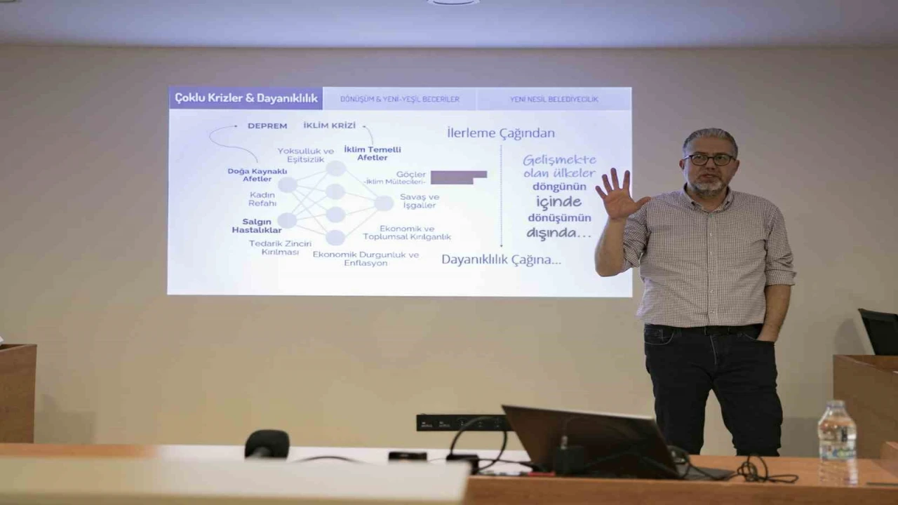 Tiryakioğlu’nun ‘Çoklu Krizler ve Dayanıklılık’, ‘Dönüşüm ve Yeni Yeşil Beceriler’ ile ‘Yeni Nesil Belediyecilik’ konu başlıklarında gerçekleştirdiği eğitimde, iklim krizi, yeni dünyanın yeni kırılganlıkları, yeşil dönüşüm, yeşil işler, yeşil meslekler, yeşil girişimciler ve teknoloji üzerinde duruldu.