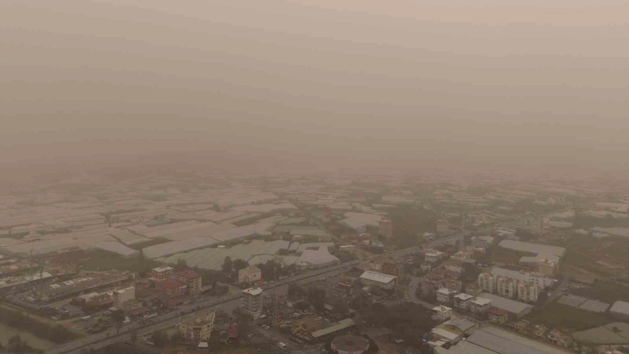 Toz taşınımı özellikle açık alanlarda ve yüksek kesimlerde daha yoğun hissedildi. Anamur ilçesinde dron ile görüntülenen toz fırtınasında, seralar puslu havada kayboldu, görüş mesafesi 100 metrenin altına düştü. Gökyüzünü kaplayan toz bulutları çevreyi kızıla bürürken, kent genelinde görüş mesafesinin belirgin şekilde azaldığı dikkat çekti.