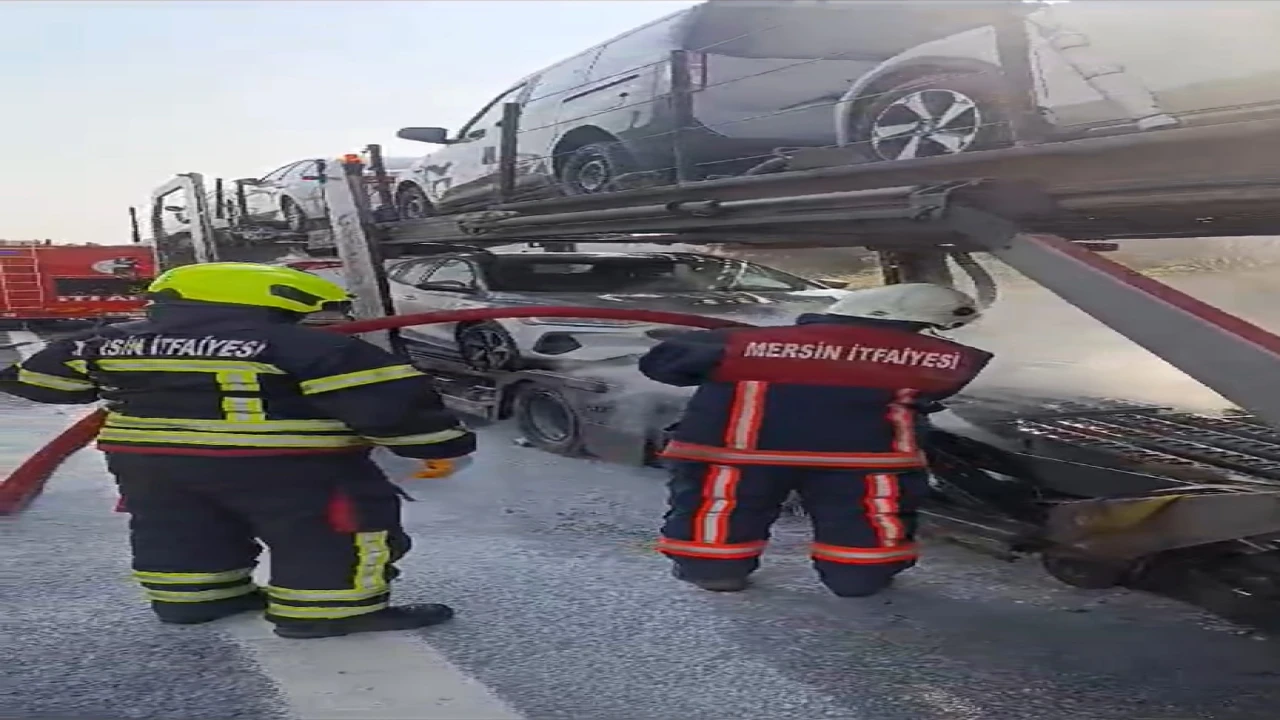Mersin’in Tarsus ilçesinde otoyolda araç taşıma römorkunda yangın çıktı.