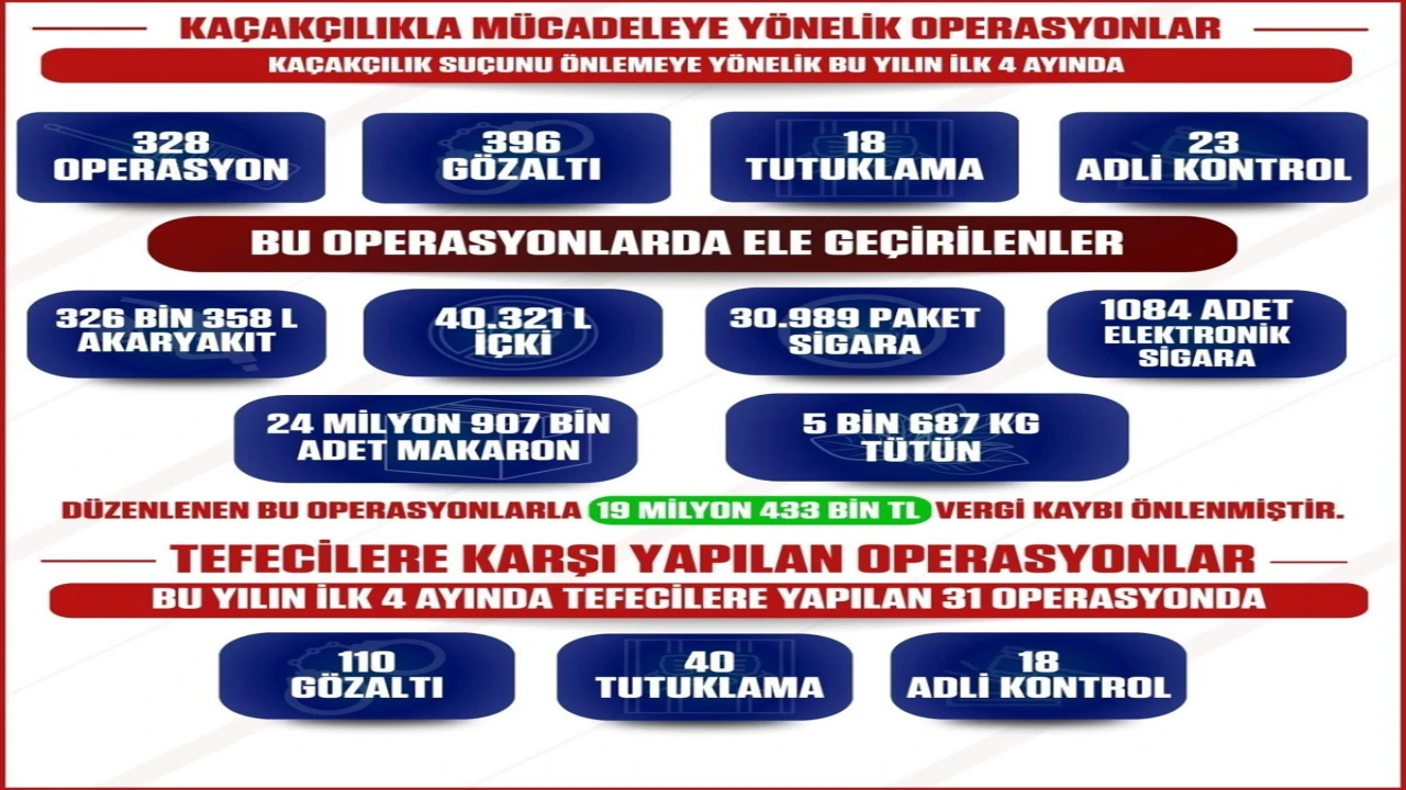 Kaçakçılıkla mücadeleye yönelik gerçekleştirilen 328 operasyonda gözaltına alınan 396 şahıstan 18’i tutuklandı, 23’üne adli kontrol uygulandı. Operasyonlarda, 326 bin 358 litre akaryakıt, 40 bin 321 litre içki, 30 bin 989 paket sigara, bin 84 adet elektronik sigara, 24 milyon 907 bin adet makaron ve 5 bin 687 kilogram tütün ele geçirildi. Düzenlenen bu operasyonlarla 19 milyon 433 bin lira vergi kaybının önlendiği bildirildi.