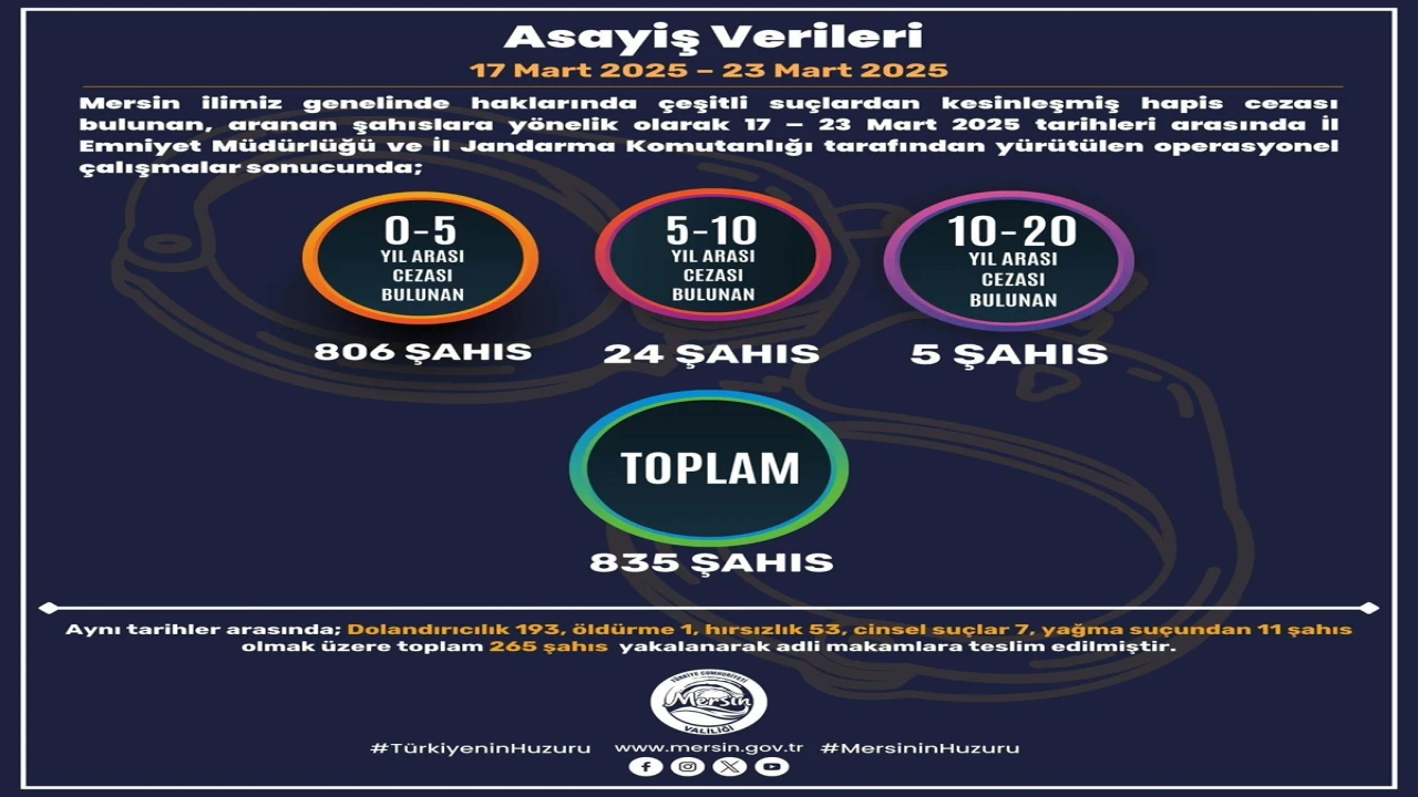 Mersin’de son bir hafta içerisinde gerçekleştirilen çalışmalarda, çeşitli suçlardan haklarında kesinleşmiş hapis cezası ile aranan 835 kişinin yakalandığı bildirildi.