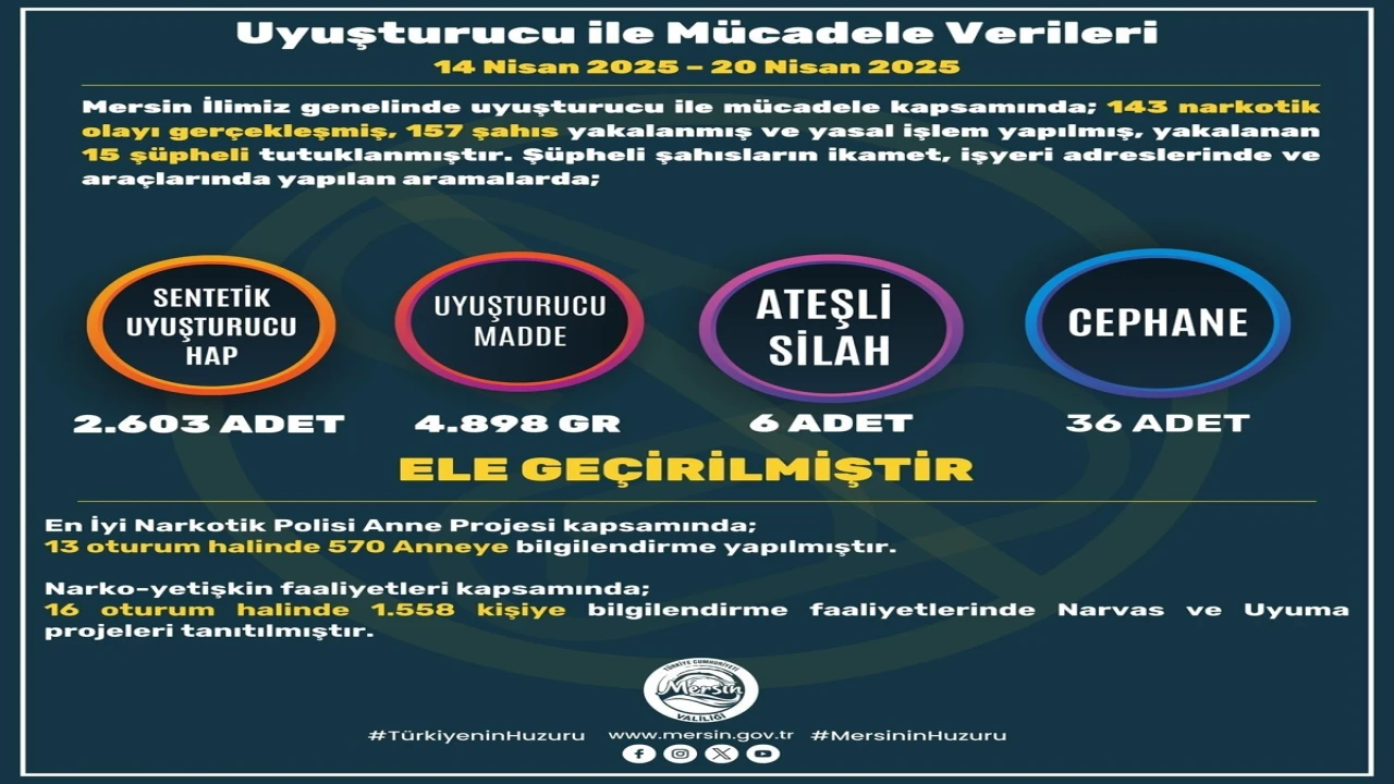 Uyuşturucu ile mücadele çalışmalarında ise 157 şüpheli yakalanırken, bunlardan 15’i tutuklandı. Şüpheli şahısların ikamet ve iş yerleri ile araçlarında yapılan aramalarda, 2 bin 603 adet sentetik uyuşturucu hap, 4 kilo 898 gram uyuşturucu madde ile 4 tabanca, 36 tabanca fişeği ve 2 tüfek ele geçirildi. En İyi Narkotik Polisi Anne Projesi kapsamında 570 anneye bilgilendirme yapılırken, narko-yetişkin faaliyetleri kapsamında ise bin 558 kişiye Narvas ve Uyuma projeleri tanıtıldı.
