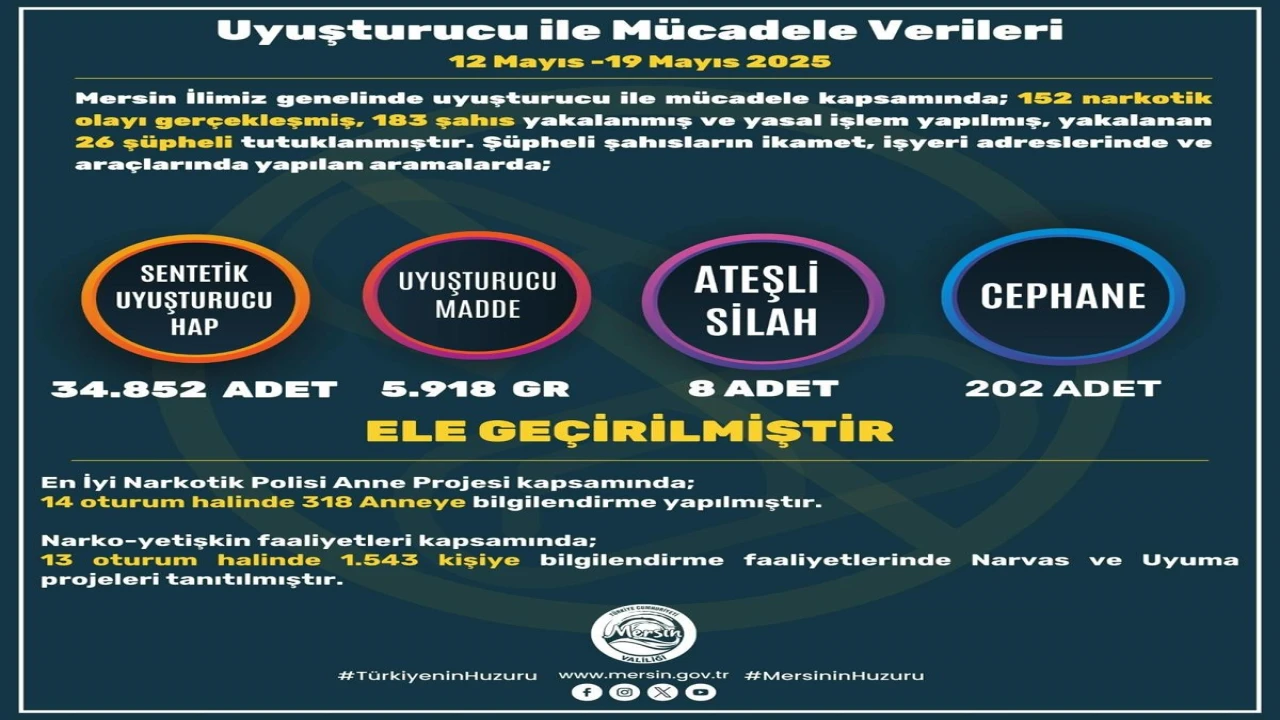 Uyuşturucu ile mücadele çalışmalarında ise 183 şüpheli yakalanırken, bunlardan 26’sı tutuklandı. Şüpheli şahısların ikamet ve iş yerleri ile araçlarında yapılan aramalarda, 34 bin 852 adet uyuşturucu hap, 5 kilo 918 gram uyuşturucu madde ile 7 tabanca, 202 tabanca fişeği ve 1 tüfek ele geçirildi. En İyi Narkotik Polisi Anne Projesi kapsamında ise 318 anneye bilgilendirme yapılırken, narko-yetişkin faaliyetleri kapsamında da bin 543 kişiye Narvas ve Uyuma projeleri tanıtıldı.