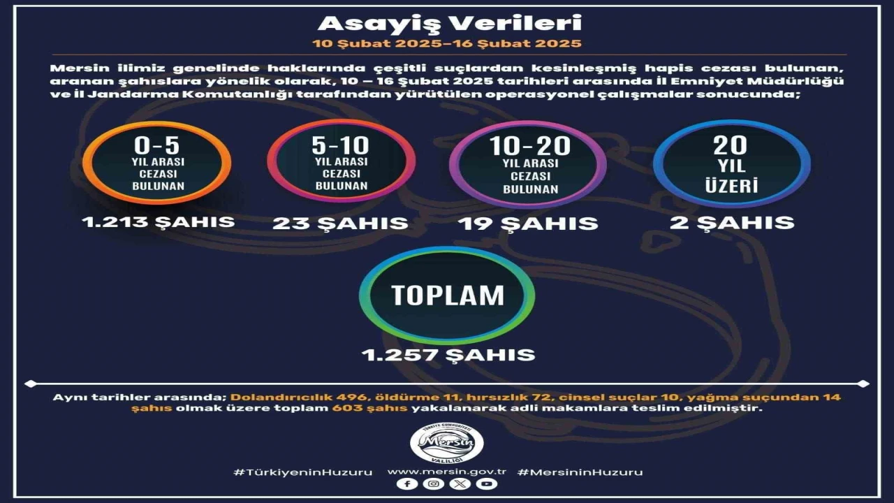 Mersin’de ’Güvenlik ve Asayiş Değerlendirme Toplantısı’ Vali Atilla Toros başkanlığında yapıldı. Toplantıda il genelinde güvenlik ve asayiş konularında gerçekleştirilen çalışmalar, alınan tedbirler ile suç ve suçlulara karşı düzenlenen operasyonlar ele alındı. Mersin’de 10-16 Şubat arasında emniyet ve jandarma ekiplerince yürütülen operasyonel çalışmalarda, haklarında çeşitli suçlardan yakalama kararı bulunan bin 257 kişinin yakalandı. Aynı tarihler arasında dolandırıcılık, cinayet, hırsızlık, yağma ve cinsel suçlar gibi çeşitli suçlardan 603 şahıs gözaltına alınarak adli makamlara teslim edildi. Gerçekleştirilen trafik denetimlerinde ise 85 bin 105 araç kontrol edilirken, 469 araç trafikten men edildi, 14 bin 731 araç ve sürücüsüne de işlem yapıldı.