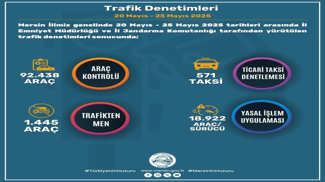 Toplantıda, ayrıca 20-25 Mayıs arasında yürütülen çalışmalara ilişkin veriler de paylaşıldı. Buna göre, belirtilen tarihler arasında yapılan trafik denetimlerinde 92 bin 438 aracın kontrol edildiği, bu araçlardan bin 445’nin trafikten men edildiği kaydedildi. Aynı dönemde 571 ticari taksinin de denetlendiği kaydedilen açıklamada, 18 bin 922 araç sürücüsüne yasal işlem uygulandığı ifade edildi.