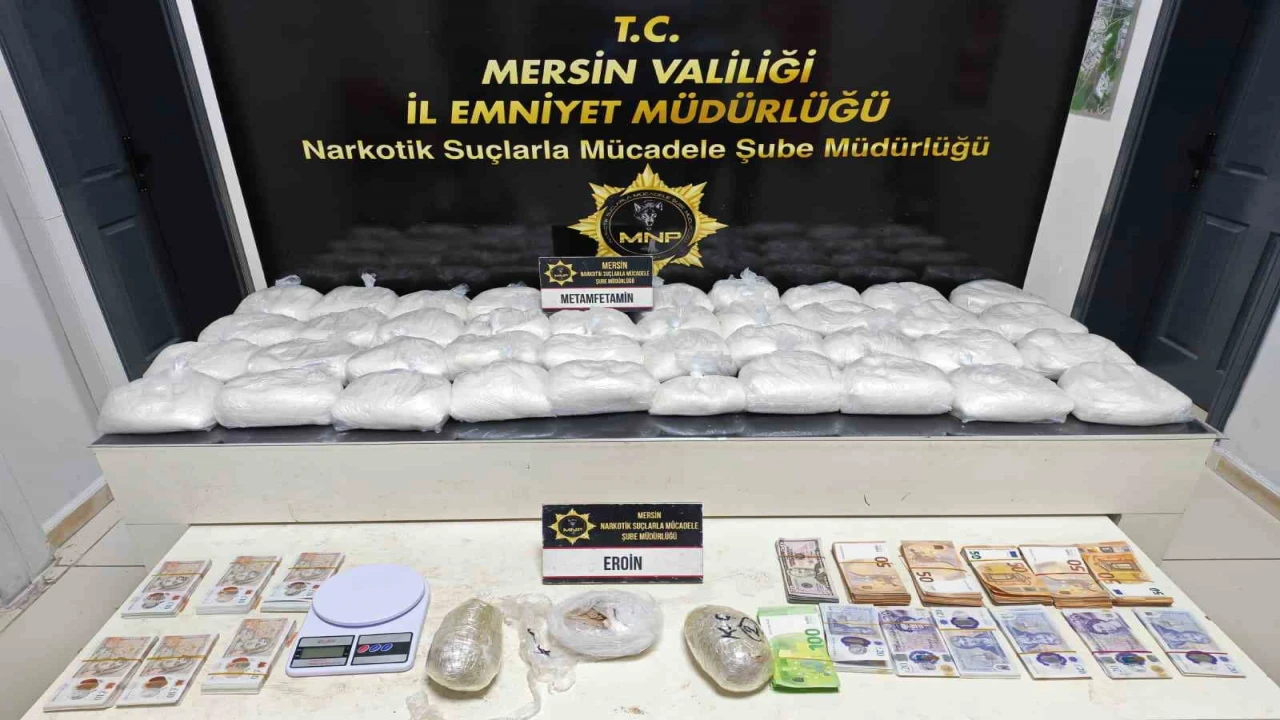 Mersin Cumhuriyet Başsavcılığı koordinesinde İl Emniyet Müdürlüğü Narkotik Suçlarla Mücadele Şube Müdürlüğü ekiplerince uyuşturucu madde ticareti yaptığı belirlenen şüphelilere yönelik Mersin ve Tarsus ilçesinde eş zamanlı operasyon düzenlendi. Gerçekleştirilen operasyonlarda 13 şüpheli gözaltına alındı. Şüphelilerin adreslerinde yapılan aramalarda 40 kilo 171 gram metamfetamin, 1 kilo 244 gram eroin, uyuşturucu ticaretinden elde edildiği değerlendirilen 56 bin 500 euro, 5 bin 250 ABD doları ve 12 bin 420 İngiliz sterlini ele geçirildi. Emniyetteki işlemlerinin ardından adliyeye sevk edilen şüphelilerden 11’i çıkarıldıkları mahkemece tutuklandı.
