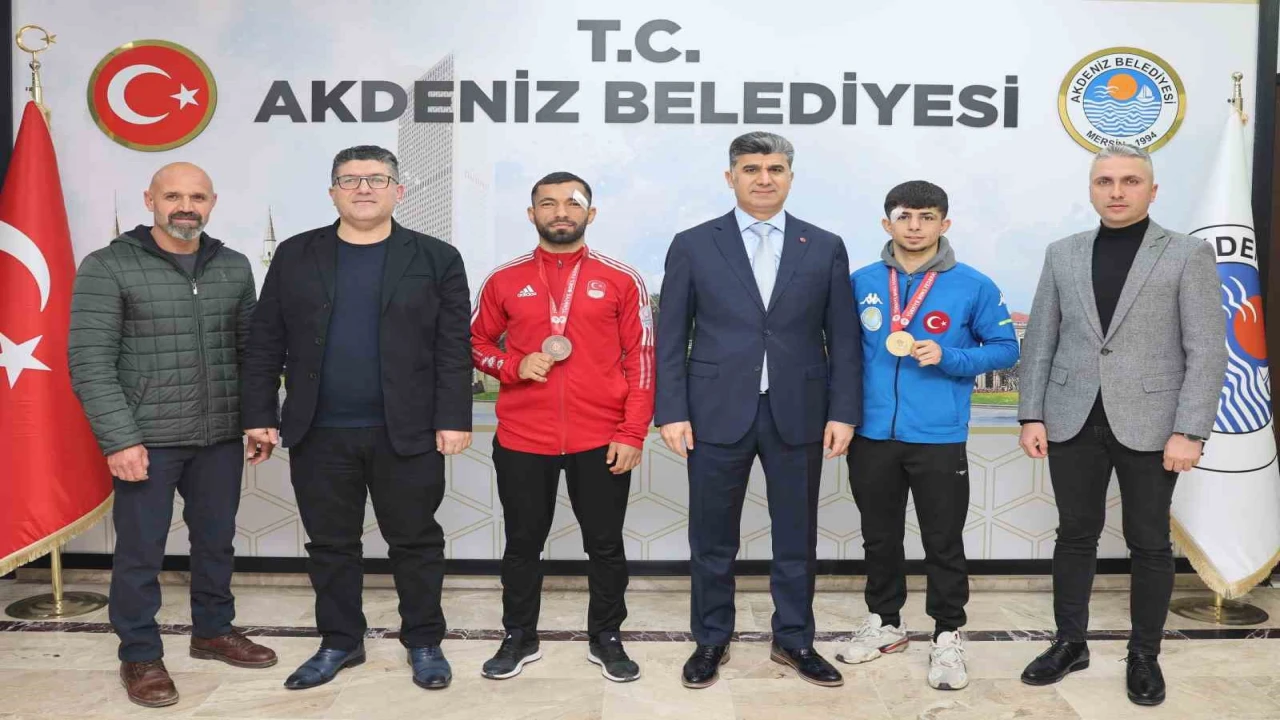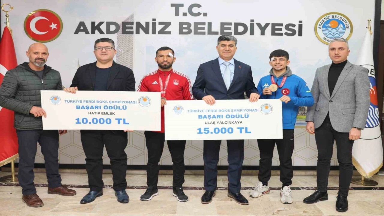 KONYA'DA DÜZENLENEN BÜYÜK ERKEKLER TÜRKİYE FERDİ BOKS ŞAMPİYONASI'NDA, AKDENİZ BELEDİYESİ SPOR KULÜBÜ'NDEN ULAŞ YALÇINKAYA ALTIN, HATİP EMLEK İSE BRONZ MADALYA KAZANDI. SPORCULAR, AKDENİZ KAYMAKAMI VE BELEDİYE BAŞKAN ZEYİT ŞENER’İ MAKAMINDA ZİYARET ETTİ.