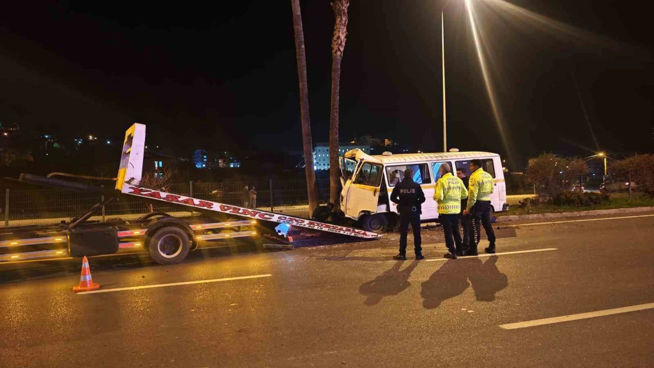 Antalya’nın Gazipaşa ilçesinde kontrolden çıkan minibüs refüjdeki ağaca çarptı. Kazada yaralanan sürücünün alkollü olduğu belirledi.