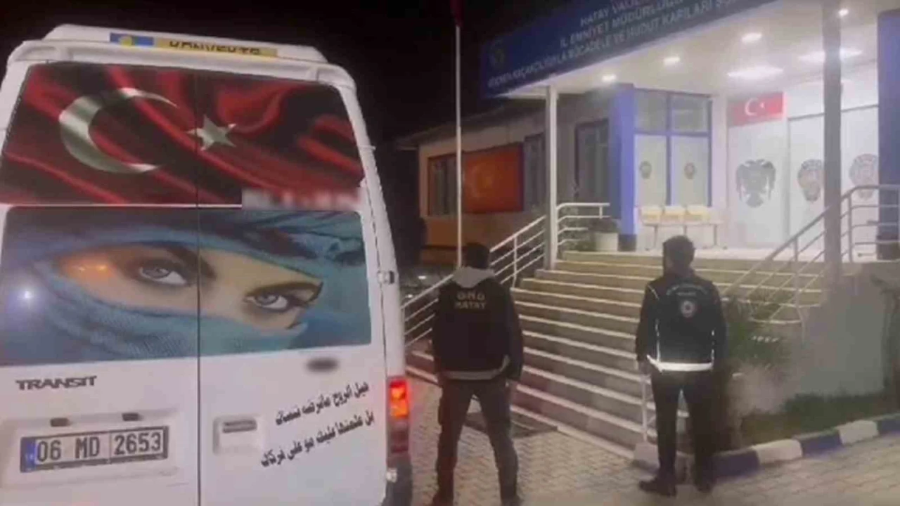 HATAY’DA POLİS EKİPLERİ TARAFINDAN DURDURULAN MİNİBÜSTE 14 KAÇAK GÖÇMEN YAKALANDI. TÜRK BAYRAĞIYLA KAPLI MİNİBÜSLE GÖÇMEN KAÇIRAN 2 ŞAHIS MAHKEMECE TUTUKLANDI.