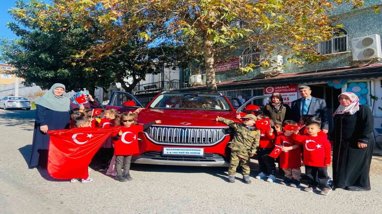 Mersin’in Anamur ilçesinde Yerli Malı Haftası kapsamında minik öğrenciler yerli üretim Togg’u yakından görme fırsatı buldu.