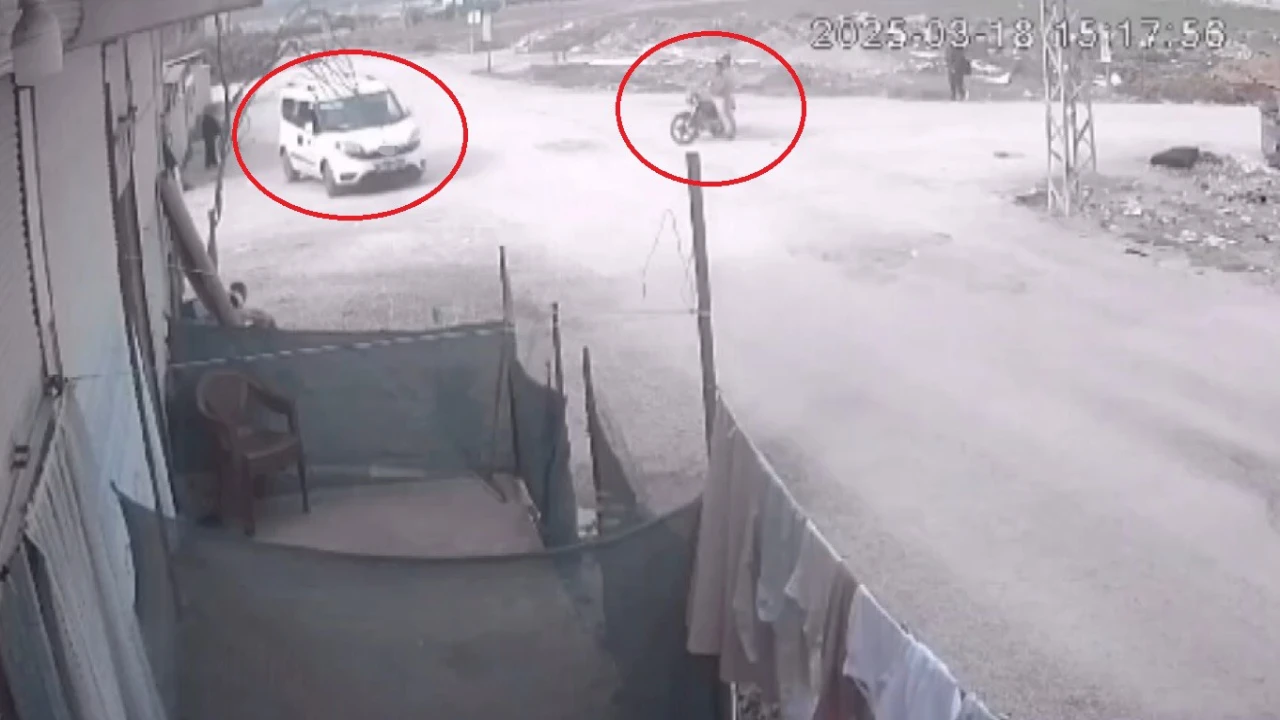 HATAY'IN REYHANLI İLÇESİNDE MOTOSİKLET İLE HAFİF TİCARİ ARACIN KARIŞTIĞI KAZADA 1'İ AĞIR 2 KİŞİ YARALANDI. MOTOSİKLETİN HAFİF TİCARİ ARACA OK GİBİ SAPLANDIĞI ANLAR GÜVENLİK KAMERASINA YANSIDI.