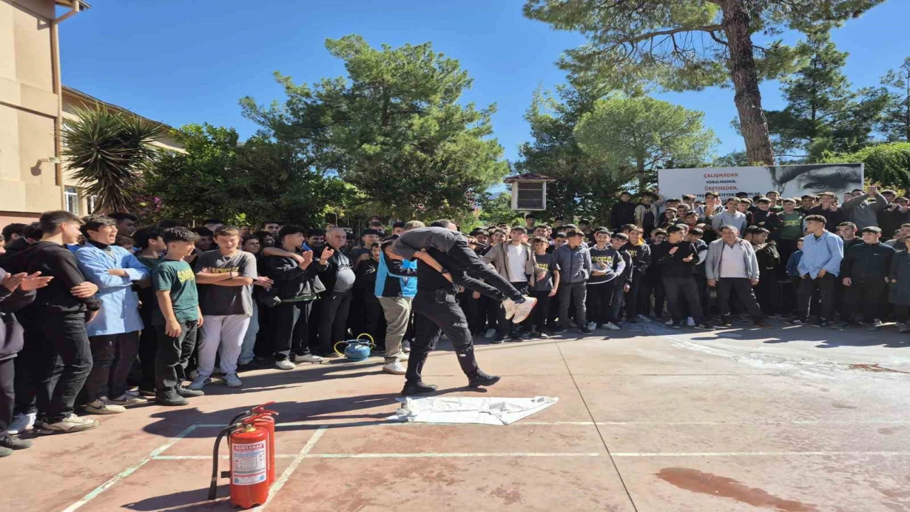 Adana’nın Kozan ilçesinde lise öğrencileri, deprem ve yangın tatbikatı gerçekleştirdi.